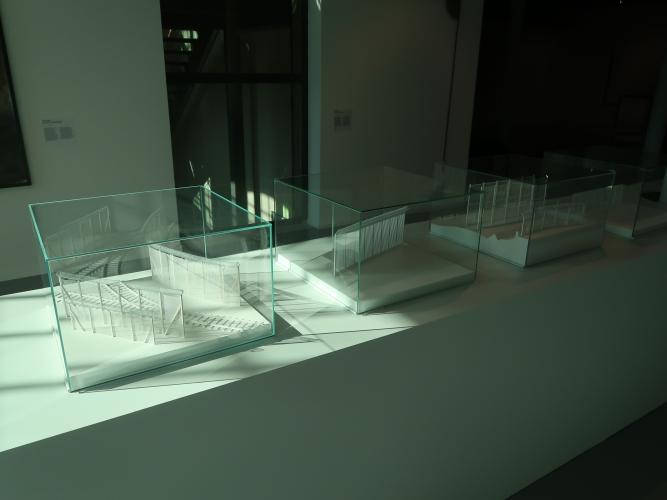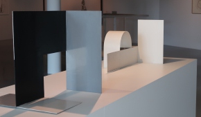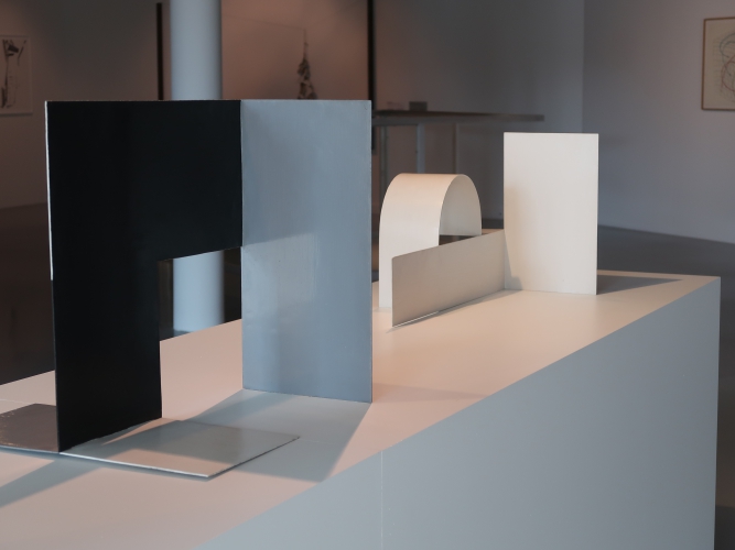 Społeczne konotacje przestrzeni są tematem zestawionych ze sobą w ciągu na jednym podeście rzeźb: dwóch kompozycji Katarzyny Kobro z 1928 roku (białej i szaro-czarnej) oraz trzech białych obiektów Łukasza Skąpskiego z 2016 roku z cyklu „Klincz. Nowa architektura granic europejskich”. Matematyczne kompozycje Kobro to propozycje na rzecz człowieka, projekty powstałe dla jego dobra i wygody, podpowiadające, jak ułatwić mu funkcjonowanie w otoczeniu. Natomiast odtworzone w miniskali przez Skąpskiego współczesne granice, które z pozoru mają podobne założenie, bo powstały przecież z myślą o bezpieczeństwie, w rzeczywistości są jednak antyludzkie: to mury i zasieki. A może każdy akt projektowania przestrzeni, w której ma funkcjonować człowiek, jest ograniczeniem jego wolności?