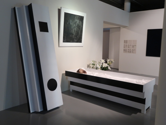 Optykę jako zjawisko fizyczne wykorzystuje Bridget Riley w obrazie „Koło przyspieszenia” z 1961 roku: czarno-białe elementy po przyjrzeniu się im zaczynają wirować. Gładki czarny prostokąt Sharon Lockhart z 2022 roku również po bacznym wpatrzeniu się okazuje się nie tylko niejednorodny, ale nawet i nie czarny – zaczynamy widzieć czarne plamy na granatowym tle. W taki sposób wizualną przewrotnością artystka odskakuje od ściany, do której malarstwo doprowadził niegdyś Kazimierz Malewicz. Bo trzeba dodać, że obraz towarzyszy nieco makabrycznemu asamblażowi kolektywu IRWIN „Zwłoki sztuki” z lat 2003–2004, odtwarzającemu rzeczywisty widok z 1935 roku: oto nieboszczyk Malewicz, „jak żywy”, w suprematystycznej, białej trumnie, na której wieku umieszczono czarny kwadrat i czarne koło. Do tego świeże lilie w wazonie. Uwaga, dosłowność tej pracy może odstręczać! Tak właśnie można – subtelnie lub dobitnie – dialogować z tradycją awangardy.