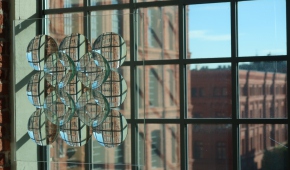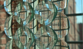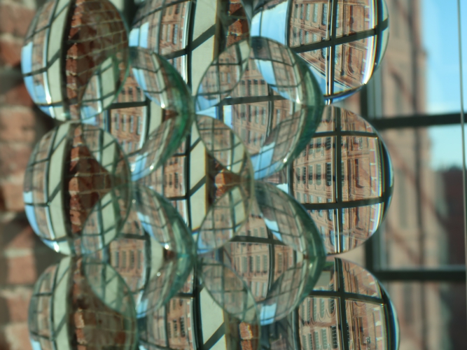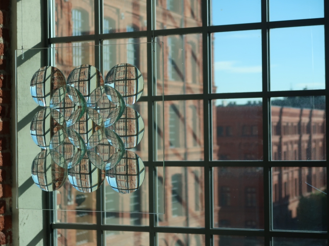 szklany obiekt Jerzego Rosołowicza z 1971 roku z soczewek, które zniekształcają widoczny za nimi obraz, umieszczono tuż przy oknie, za którym widać pofabryczne, ceglane zabudowania. Jakby stąd był. Gdyby ów obiekt powieszono gdzie indziej, byłby subtelnym dziełem sztuki, tutaj jest, zgodnie z intencją artysty, elementem industrialnym o technicznym charakterze i chłodzie, a podkreśla to tytuł „Neutronikon S27”.