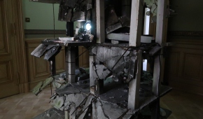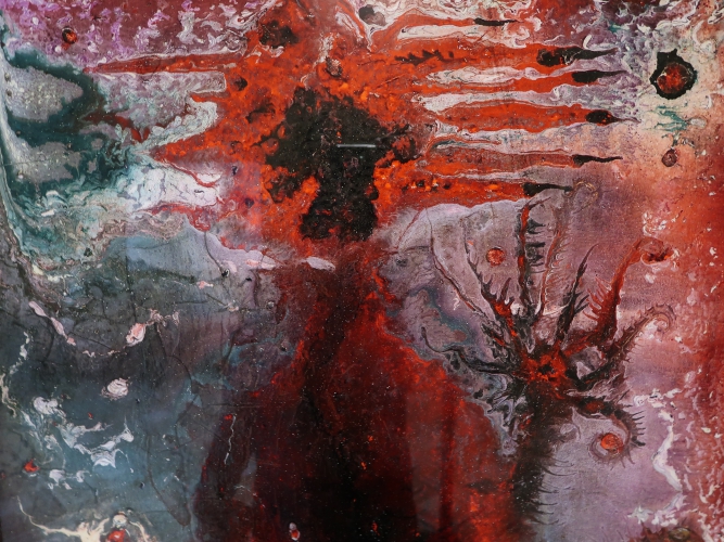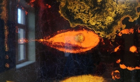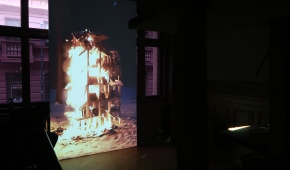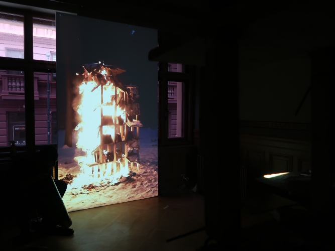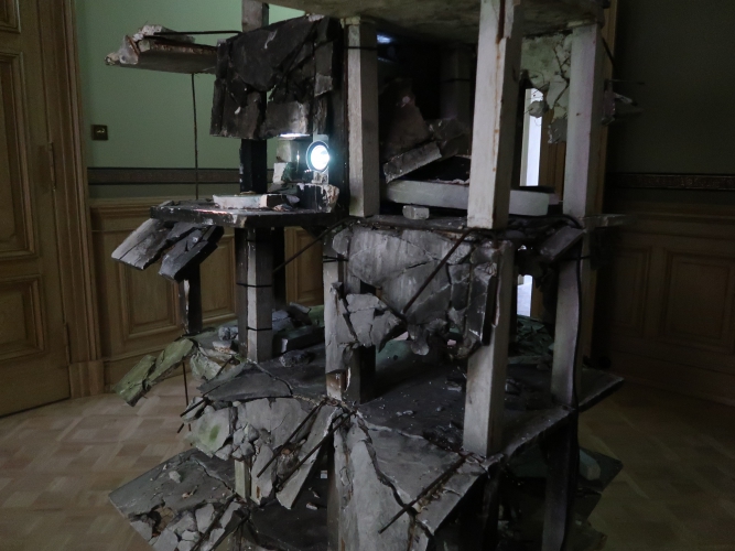 Na początek (choć zwiedzanie równie dobrze można zacząć w innym punkcie) najmocniejszy, niepokojący akcent – wyłaniająca się z ciemności konstrukcja Tomasza Matuszaka z nadpalonego zbrojonego gipsu, która przypomina pozostałości wieżowca po wybuchu, oraz film, na którym owa konstrukcja płonie. „Burning Structure” mówi o momencie, w jakim obecnie znajduje się ludzkość: tradycyjne struktury społeczne i polityczne już nas uwierają, ale jeszcze nie mamy pomysłu na nowe.