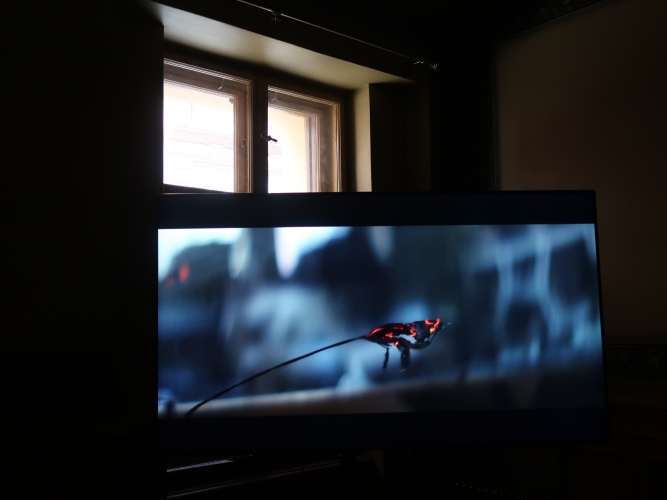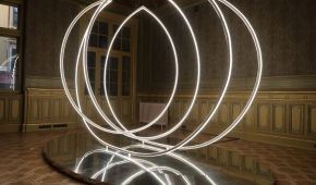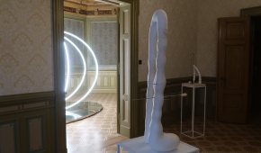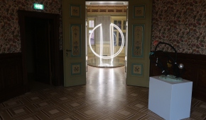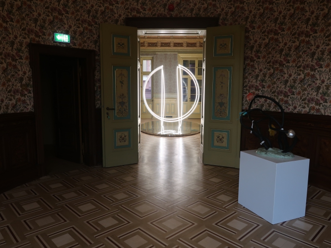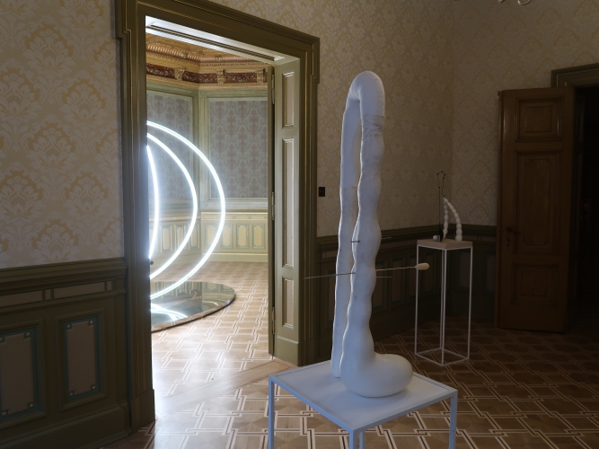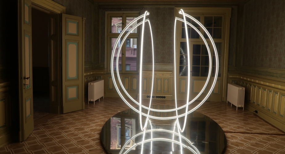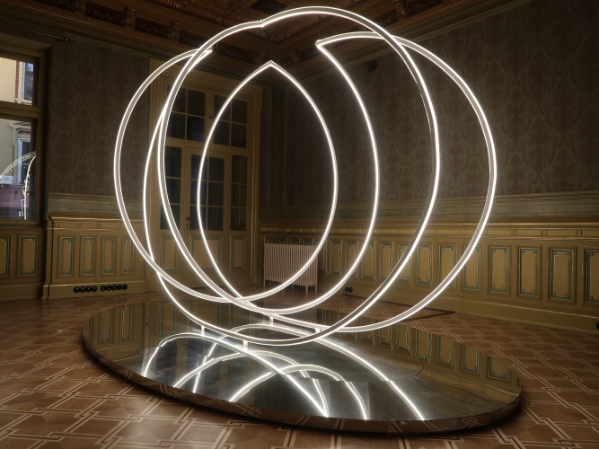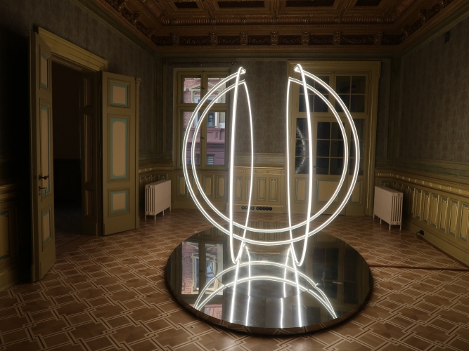 Również z ciemności wydobywają się świecące elipsy z subtelnej instalacji Karoliny Hałatek „Double Parallel” – i tutaj także pojawia się niepokój, elipsy są bowiem niedokończone, urywają się w pewnym momencie, łącząc się zarazem z innymi, co wygląda, jakby cała konstrukcja została przedzielona niewidocznym lustrem. Do tego wszystko to powiela się w lustrzanej podstawie konstrukcji. Daje to efekt lewitowania – obiektu, ale i widza – w kosmicznej przestrzeni. Znajdując się w takim położeniu, nie jesteśmy w stanie zbudować sobie wyraźnego, jednorodnego obrazu rzeczywistości.