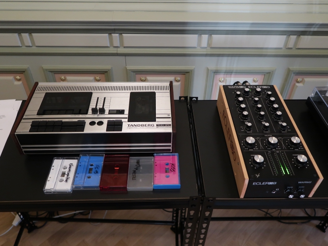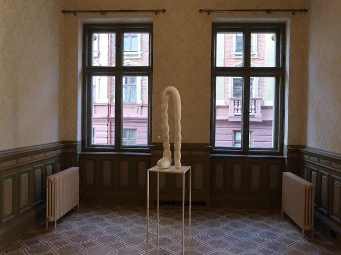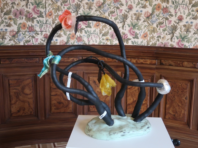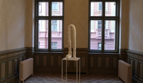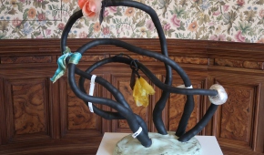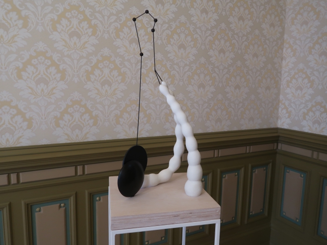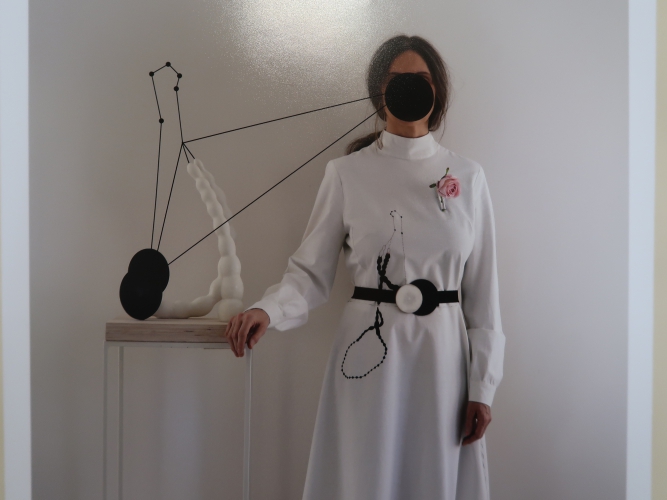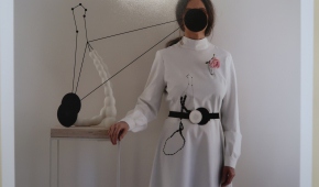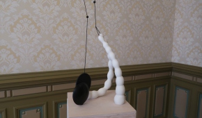 Jeden z niedużych obiektów Magdy Moskwy nawiązuje do jej dawnych obrazów z kwiatowymi tłami – to czarne „pnącza” obumarłej rośliny, na której pozostały zwiędnięte, ale jeszcze pachnące kwiaty. Przemiana jako naturalne, nieuniknione zjawisko. Także i tutaj tło (zastane) jest kwieciste – to tapeta, którą wyłożone są ściany pokoju (ciekawe, że motywowi kwiatów w twórczości Moskwy poświęcona była również ekspozycja tej artystki trwająca niemal w tym samym czasie w Galerii Opus). Kolejne dwa obiekty Moskwy także wynikają z jej wcześniejszych prac, ale już innego rodzaju – zawierających reliefowe jasne elementy kojarzące się z jelitami. Tutaj owe „jelita”, które można chyba rozumieć jako „obnażenie się” artystki w akcie tworzenia, przybierają formy autonomicznych, abstrakcyjnych konstrukcji. W jednej forma przebita jest szpilami, druga przywodzi na myśl rzeźby Katarzyny Kobro, do tego miękka forma „jelita” została połączona przestrzennymi liniami z dwoma „twardymi” czarnymi kołami. Zimną matematykę ociepla organiczność formy i kruchość, która jest cechą wszystkich dzieł Magdy Moskwy niezależnie od techniki wykonania. Jest jeszcze zdjęcie, na którym ta druga rzeźba została zintegrowana poprzez geometryczne formy z postacią kobiety – prawdopodobnie samej autorki. Moskwa i jej sztuka to jedność.