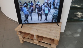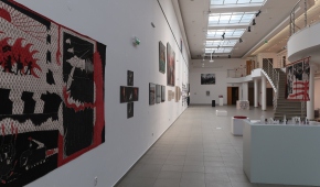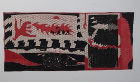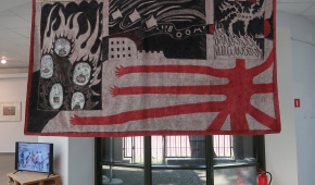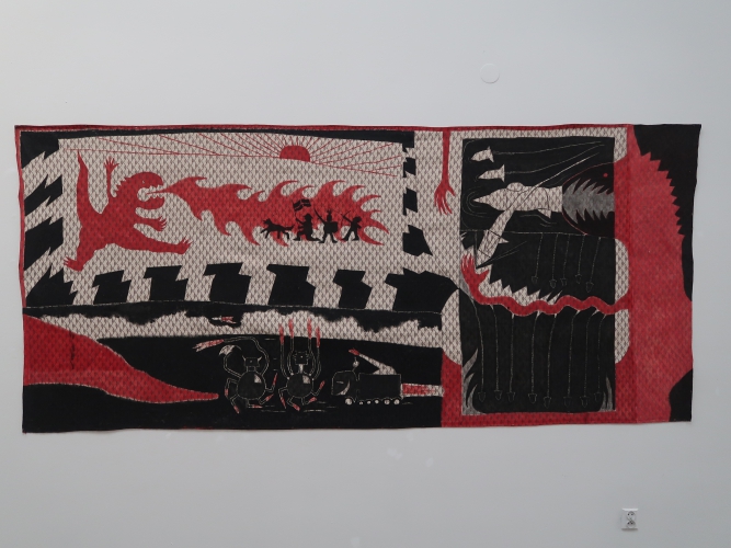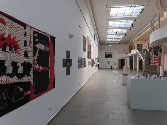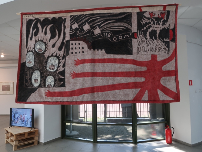 Dziewczynka tuląca ptaka mogła być dla innego dziecka uosobieniem pokoju, a jak mogłaby wyglądać wojna widziana jego oczami, pokazują biało-czarno-czerwone tkaniny Ignacego Tybora z 2024 r.: „Smoka problemy z technologią i wspomnienie starych dobrych czasów” ze smokiem ziejącym na żołnierzy z różnych epok i z machinami zapalającymi oraz „Bum” z bombami robiącymi „boom” i płonącymi ludźmi. Estetyka dziecięcych rysunków sprawia, że te przedstawienia są tym bardziej porażające.