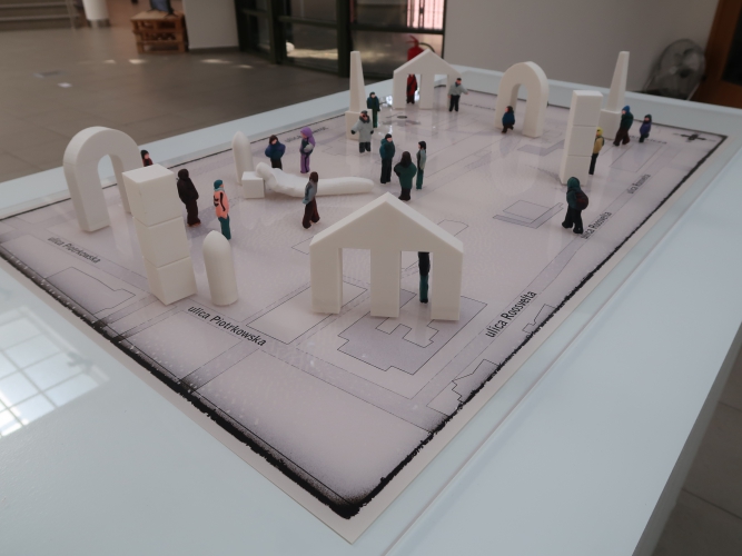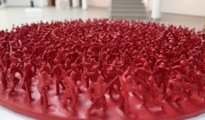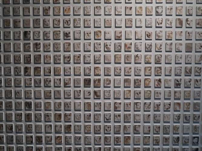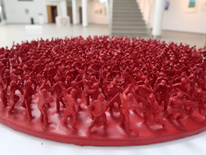 Wojna to anonimowość – żołnierzy, oprawców i ofiar. Zbigniew Olszyna w rzeźbie „Walka” z 2017 roku w równych okręgach na czerwonym kole ustawił walczące ze sobą czerwone figurki niemal identycznych żołnierzyków. „Strefa duchów – Gaza” Wiktorii Kacprzak (2025) to fryz z rzędami setek malutkich przedstawień rozmazanych, nierozpoznawalnych twarzy.