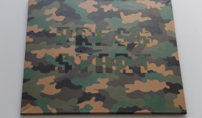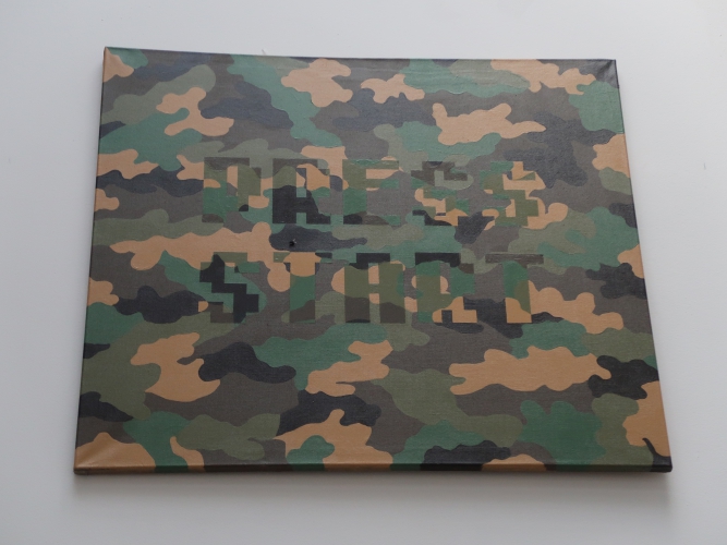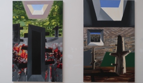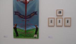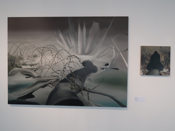 Nad wejściem na ekspozycję zawisł obraz Zbigniewa Olszyny z 2014 roku, zamalowany w plamy moro z wyłaniającym się spośród nich napisem „Press Start”. Wystarczy wcisnąć przycisk – poszukać pretekstu, by wywołać konflikt. A „Każdy konflikt zawsze rozrywa” – jak czytamy na inspirowanym estetyką kiczu obrazie Grupy Łódź Kaliska, podzielonym czerwoną, pionową smugą na dwie równe części („Romeo i Julia. Obraz 1/18”, 2025).