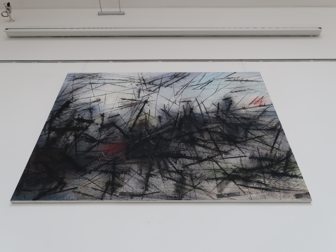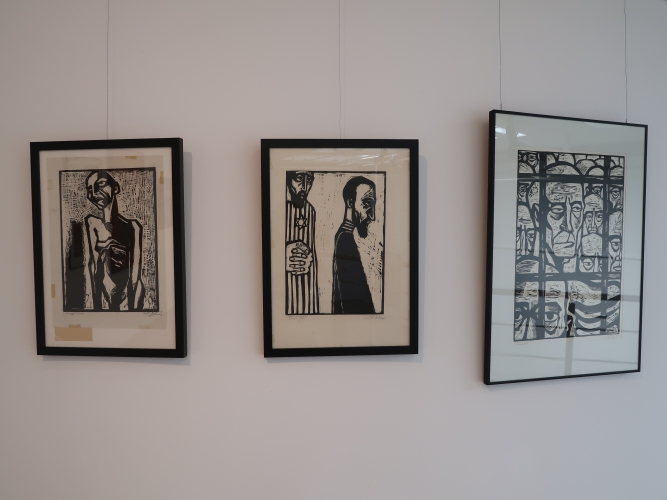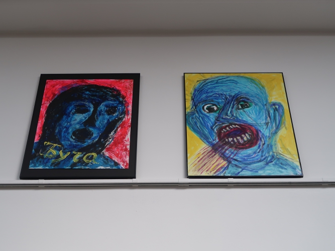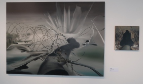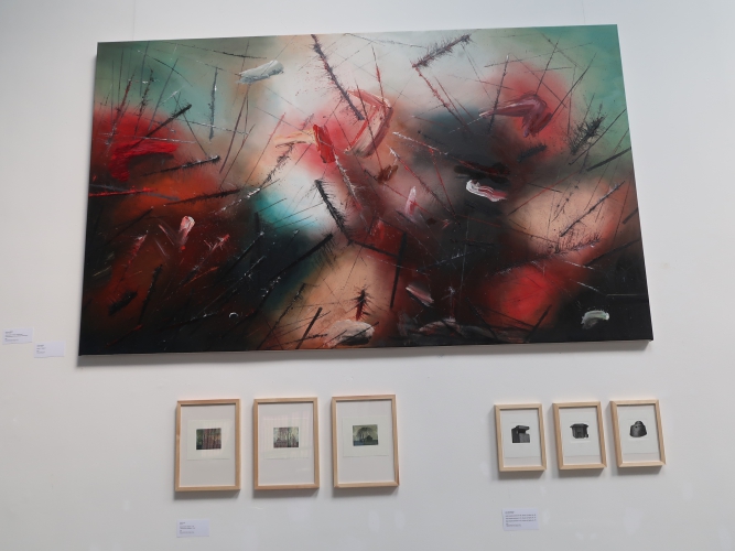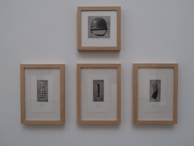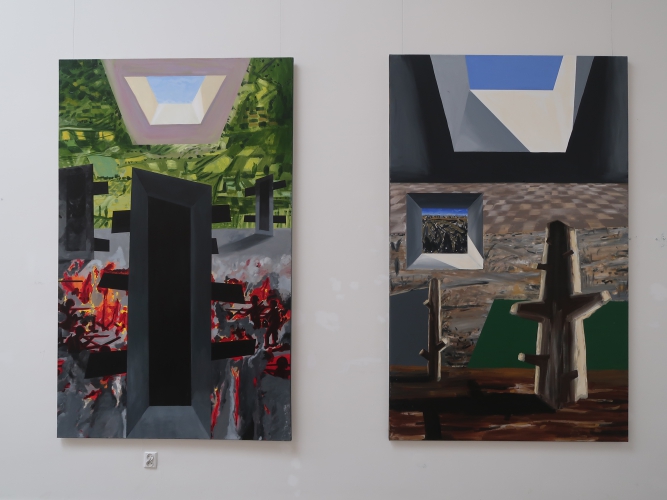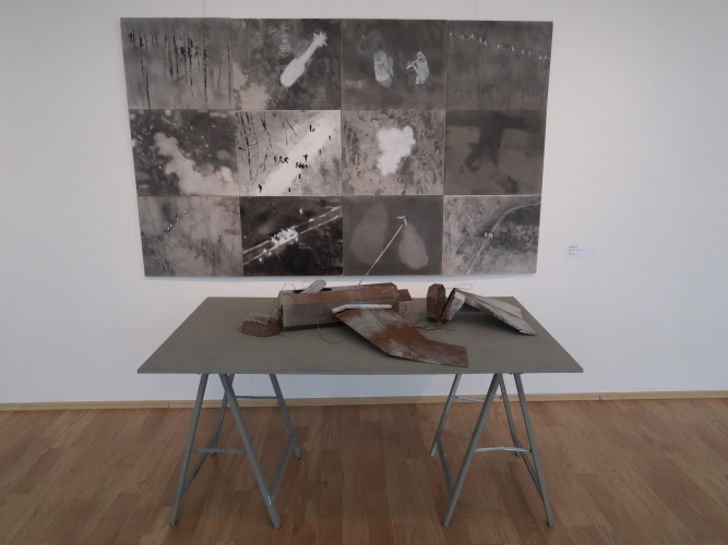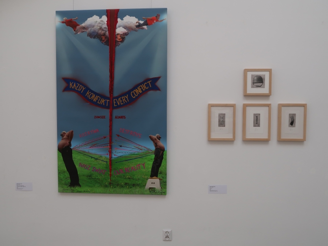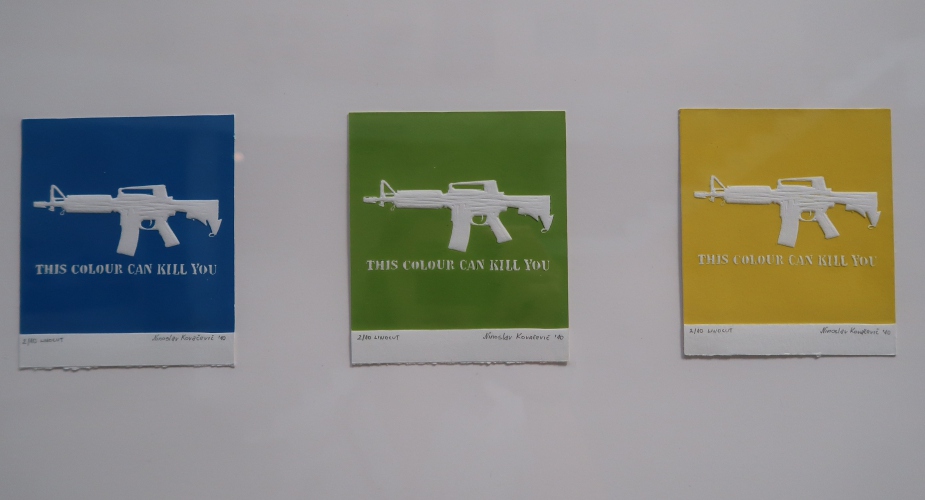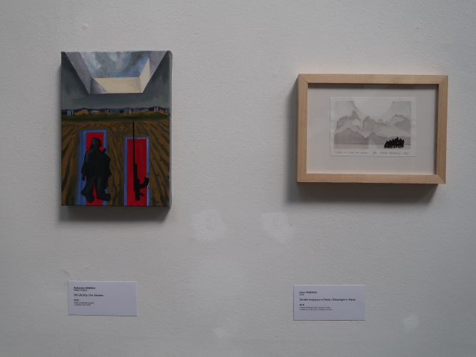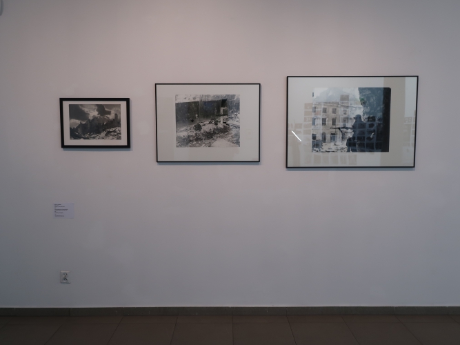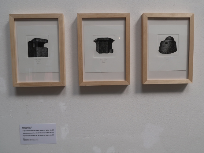 Z tymi dynamicznymi przedstawieniami kontrastują delikatne, malutkie grafiki: Kalii Kalde z 2018 roku, przedstawiające zniszczone domy w dawno opuszczonych wioskach, i Edvina Dragicevića (z 2016 roku), pokazujące iluzje bezpieczeństwa – pancerne osłony-bunkry.