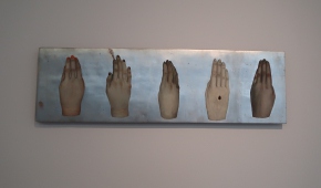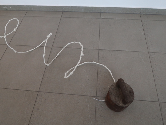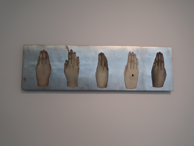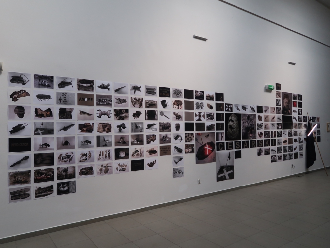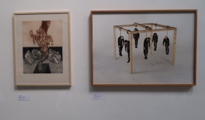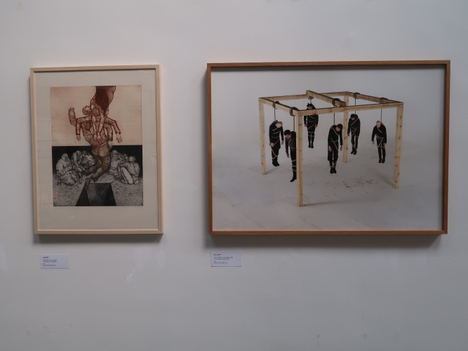 Nie brakuje przedstawień tego, co z wojną kojarzy się najbardziej: przemocy, udręczenia, bólu, strachu i upokorzenia. Leszek Rózga na grafice z 1970 roku pokazuje umęczonych ludzi zbitych w masę. Tomasz Wysocki w fotografii z serii „Exodus” (2015) – mężczyzn podwieszonych na linach do drewnianej konstrukcji. Benon Liberski niczym Andrzej Wróblewski obrazuje rozstrzelanie (na grafice i na płótnie, 1962): mały, bezbronny, półnagi człowiek pochyla głowę pod lufą pistoletu, trzymanego przez stojącego tuż za nim wielkiego oprawcę w mundurze. Na wystawie znalazł się też niespodziewanie obiekt Magdaleny Moskwy z 2005 roku – dłonie na srebrnym tle, jedna z nich palcem wskazującym znaczy krwawy ślad.