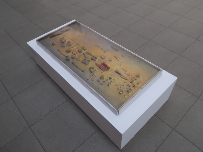 Obiekty Jonasza Sterna („Kompozycja żółta” z 1979 roku i „Kompozycja różowa” z 1982 roku) nasuwają skojarzenie z ekshumacjami pozostałości ofiar wojen: to fragmenty kości tkwiące w ziemi.