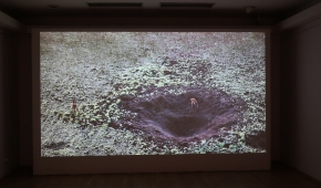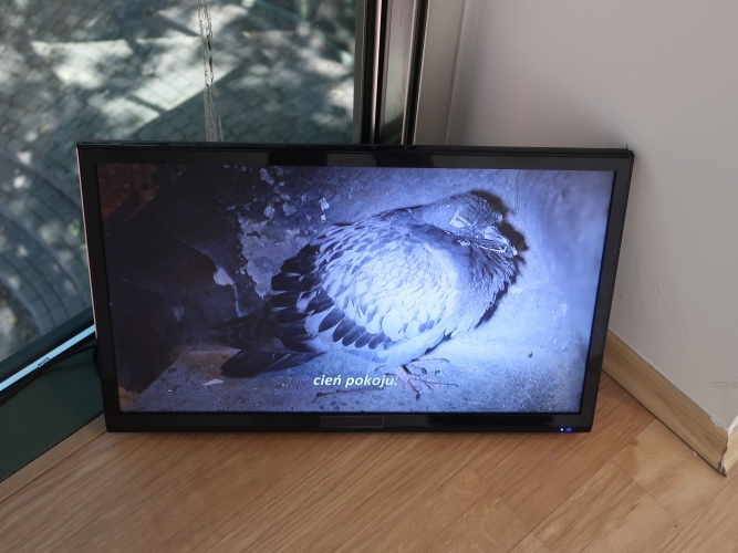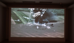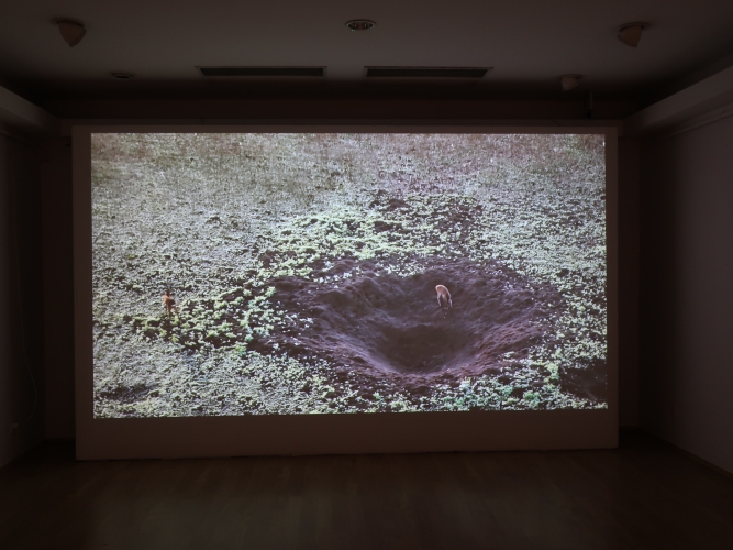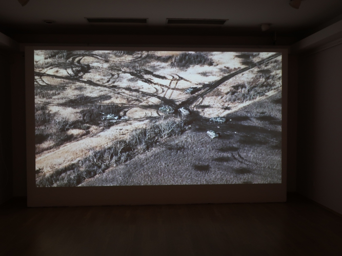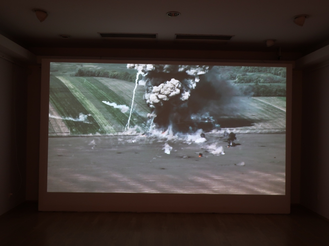 Clue tej wystawy, jej punktem kulminacyjnym jest dla mnie film Dmytro Hreshki, złożony z pojedynczych ujęć wojennej rzeczywistości Ukrainy. Kikuty drzew, czołgi, wystrzały, sarny stojące przy leju po bombie. Powtórzenie widoków znanych z frontów I wojny światowej: hektary spalonej ziemi niczym przedsionek piekła – filmowane z góry jakoby z boskiej perspektywy. Ale Bóg jedynie patrzy – i tak jak my, widzowie, nie dostrzega ludzi, tylko efekty ich działań. To… piękne, hipnotyzujące obrazy. Ogląda się je z poczuciem winy – źle czuję się z tym, że te kadry mi się podobają. I może właśnie emocjonalne zaangażowanie sprawia, że ta praca przemawia do mnie najmocniej.