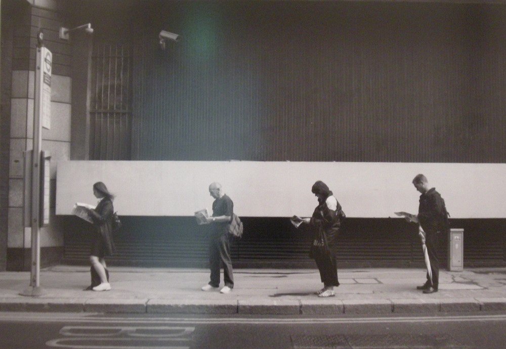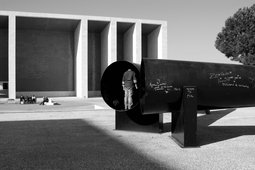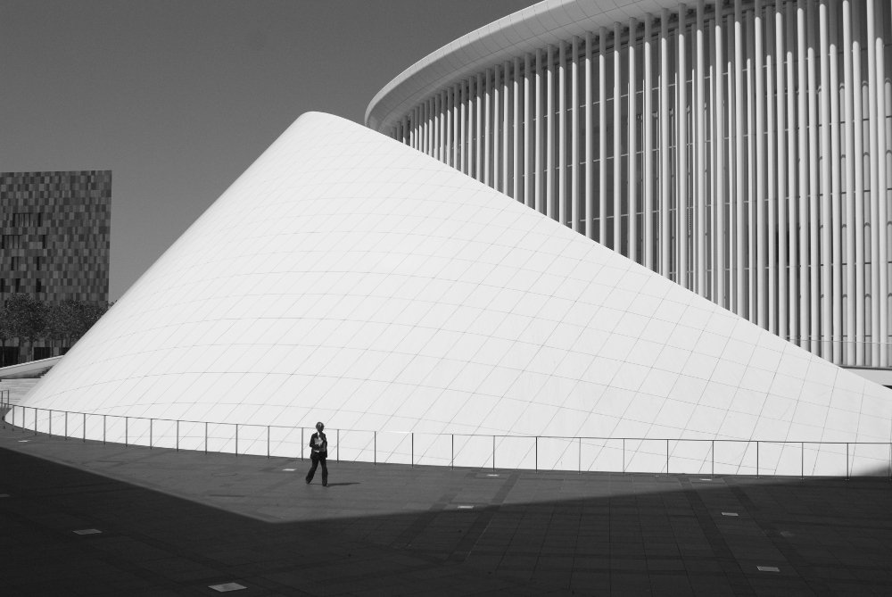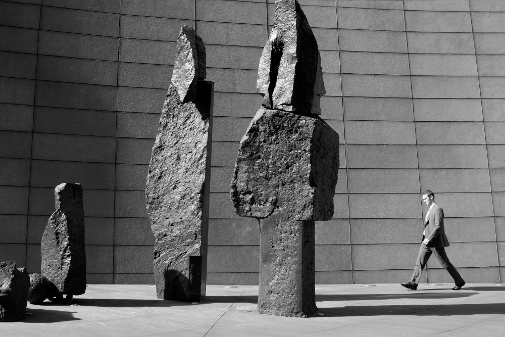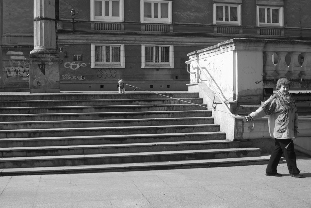 szlachetniejszego – FORMA.To, że oglądamy fragmenty europejskich miast, dają do zrozumienia tylko tytuły poszczególnych zdjęć (rzadko jakieś napisy). Te fotografie mogłoby być wykonane wszędzie. Są uniwersalne jak uniwersalna jest sztuka awangardowa, do której artysta nawiązuje – to konstruktywistyczne układy figur, linii, łuków są właściwym tematem projektu. A podkreśla to czarno-biała tonacja. Człowiek jest tutaj bardzo ważny, ale nie jako Europejczyk, także nie jako jednostka – raczej jako dodatkowy element formalnej układanki, jej nieprzewidywalny punkt wzbogacający kompozycję, skupiający uwagę odbiorcy. Figura człowieka jest często kontrapunktem do tego, co w tle: przecinających się linii, płaszczyzny ściany, geometrycznych brył budynku. Przełamuje surowość otoczenia, nadaje mu „ludzki” charakter. Wpisuje się w rytm, albo go zakłóca. A często sama ten rytm buduje – wraz z innymi figurami ludzi albo zwielokrotniając się dzięki odbiciom. Tak samo ważny jak człowiek jest jego cień – również buduje kompozycję.