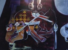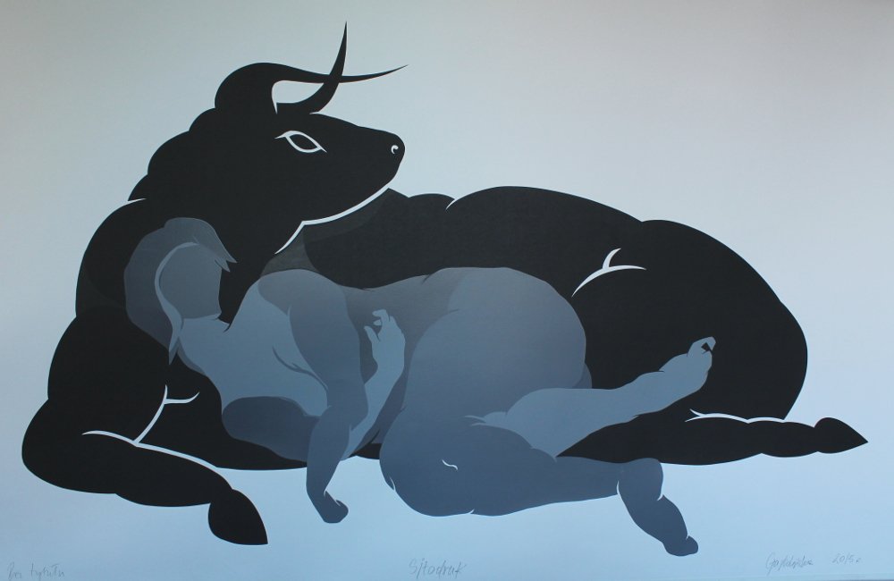 Joanna Garbolińska zaprezentowała dwa duże sitodruki z motywami symboliczno-mitologicznymi: sylwetką nagiej kobiety wtulonej w sylwetki byka i węża. Połączenie prostoty czystych plam czerni i szarości, z których zbudowane są postaci, z pewną ornamentyką konturów.