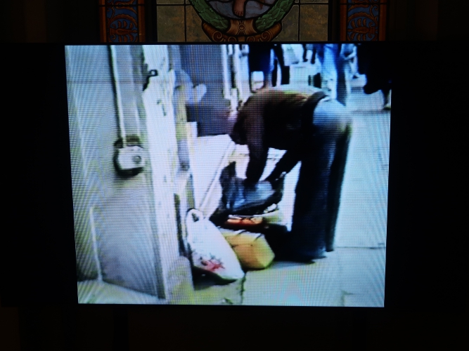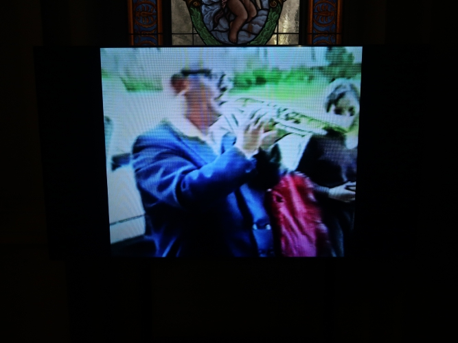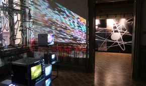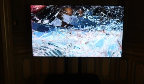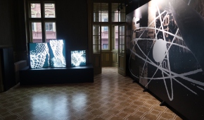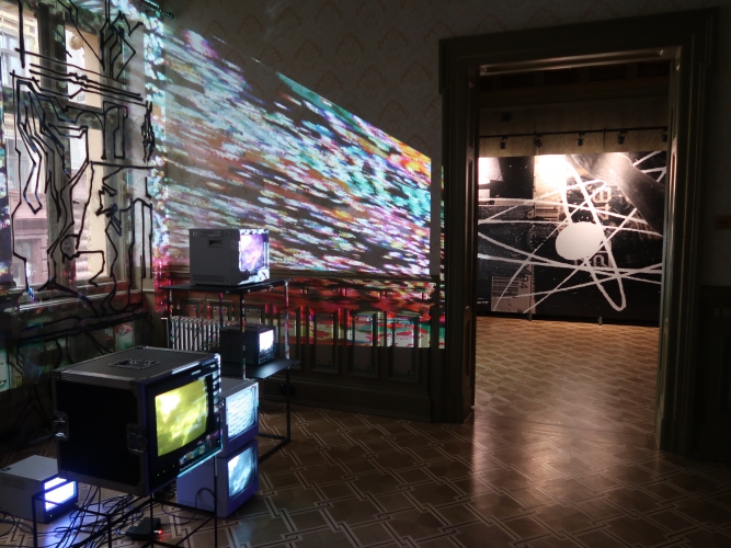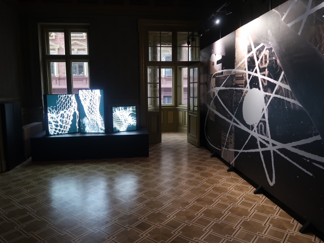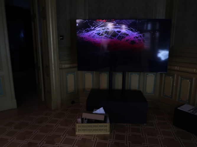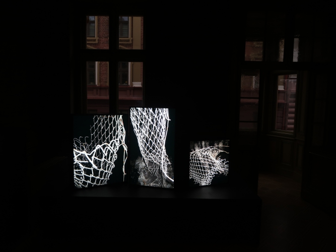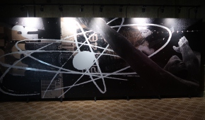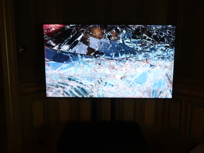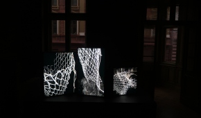 Dalej mroczny nastrój jest podtrzymywany poprzez zdjęcie fragmentów skręconej i porozrywanej siatki ogrodzeniowej, oświetlonej mocnym reflektorem. A poczucie zagrożenia wzmaga jeszcze zatrważająca kakofonia dźwięków miażdżonej podczas uderzenia blachy oraz innych, nieokreślonych, towarzyszących równie jazgotliwemu, migotliwemu filmowi, gdzie spośród nieustannie zmieniających się abstrakcyjnych obrazów wydobyć można od czasu do czasu kształty zmiażdżonych samochodów (do tego instalacja w postaci skrzynki, w której znalazły się m.in. cegłówka, pojemnik z ołówkami i pusty karton – czy to mówi o bezsensowności myślenia o życiu po życiu, czy o tym, że cały ten nasz życiowy bagaż w chwili śmierci traci znaczenie?). Wszystko to zestawione z wielkim na prawie pół ściany wydrukiem kolażu z rysunkiem orbit, fragmentami opakowań z kodami kreskowymi i częścią posągu przedstawiającego mężczyznę wznoszącego ręce ponad głowę – tu może w geście otwartości na to, co ma nadejść…