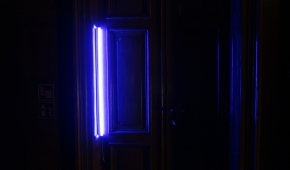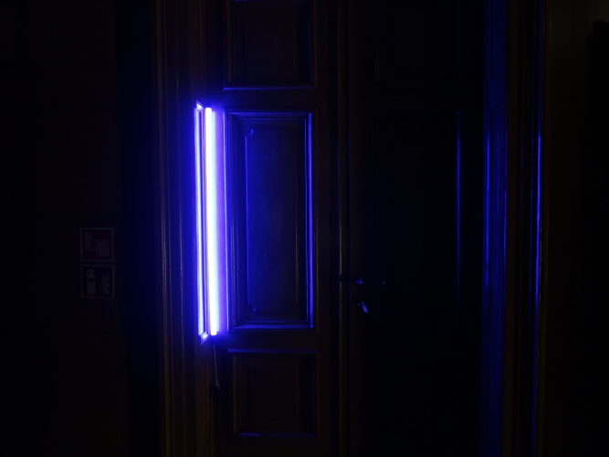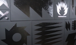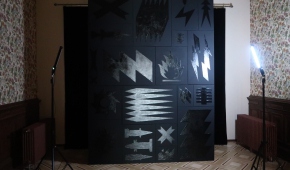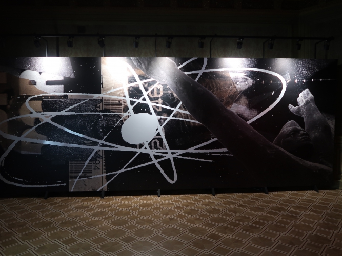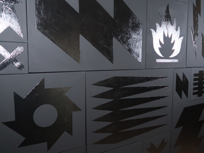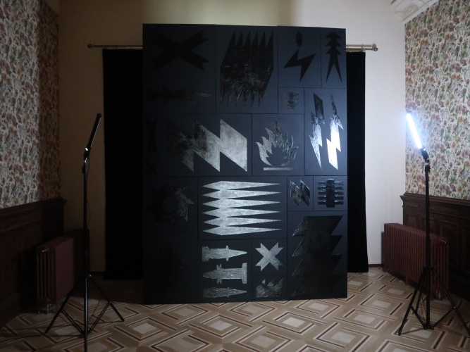 Jest jeszcze czarna ściana z czarnymi (w nieco innym odcieniu), agresywnymi znakami, symbolami, od czasu do czasu rozświetlana w całości lub punktowo. Czy to prymitywne pismo tych, którzy przetrwają i będą musieli zaczynać wszystko od nowa?