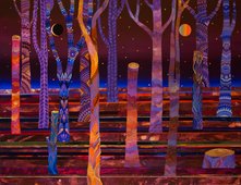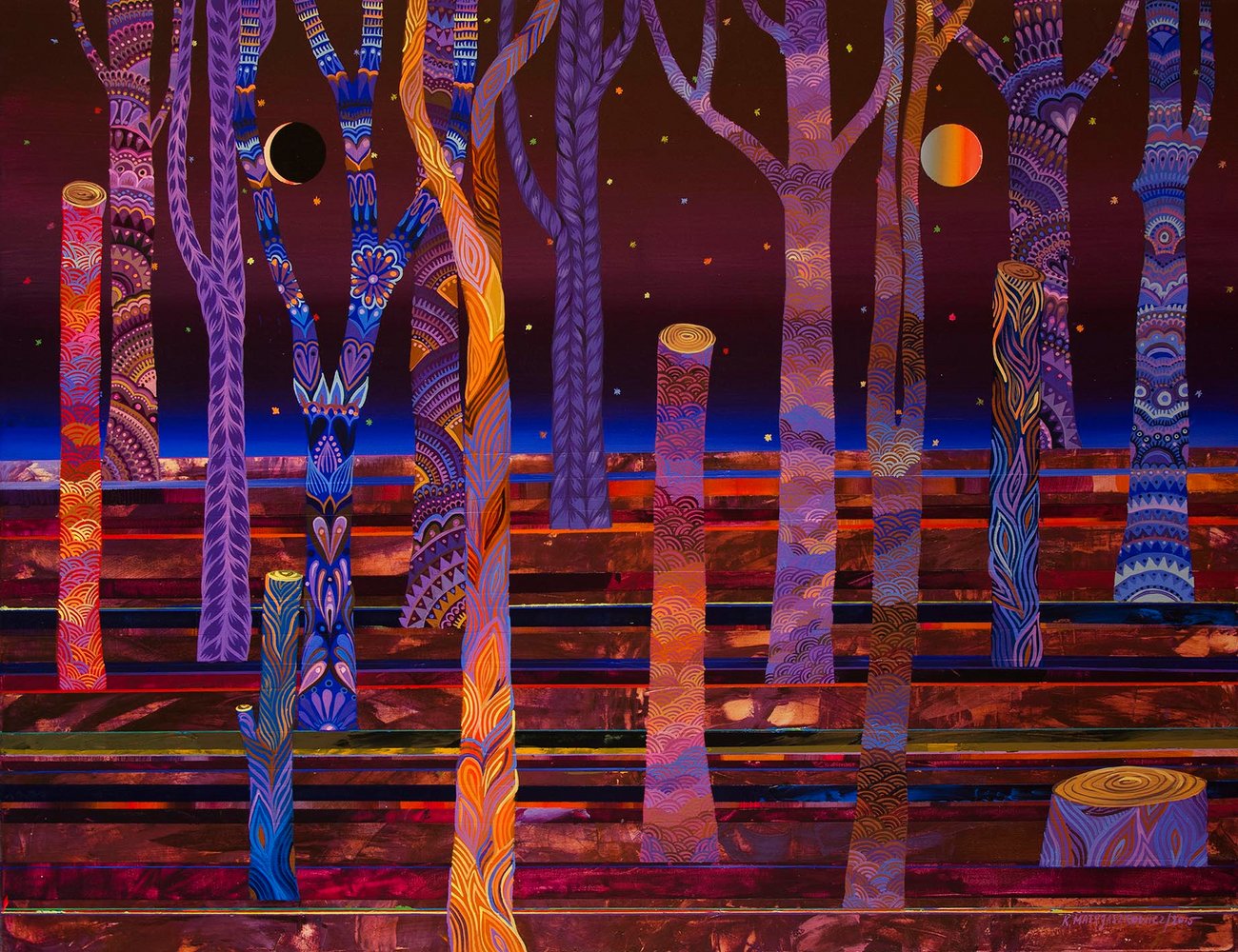 ornamentami pnie drzew (układ tych pni przywołuje surrealistyczne