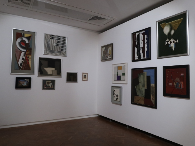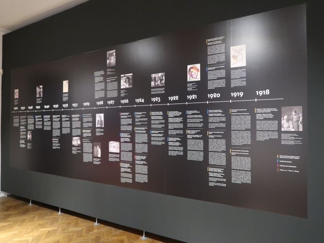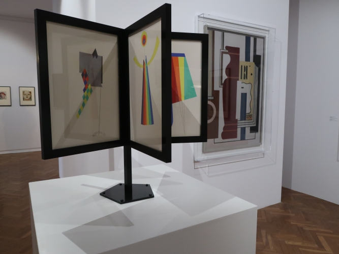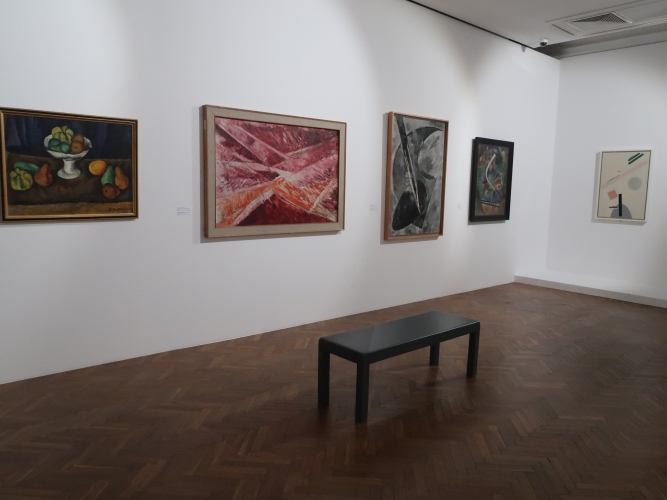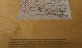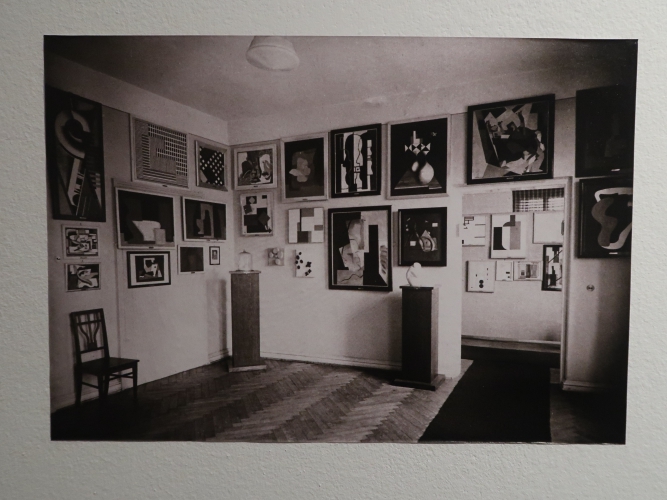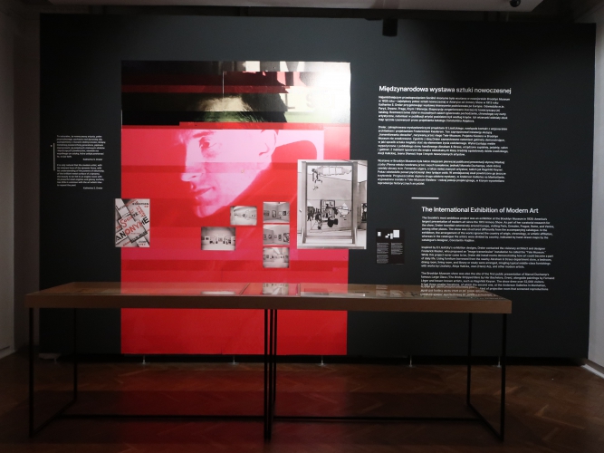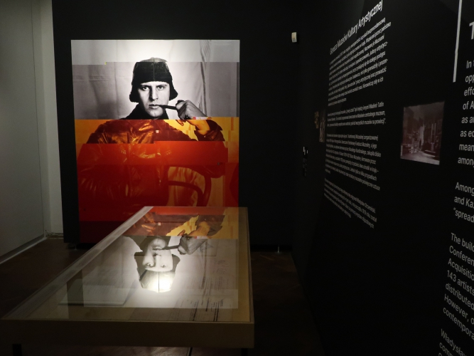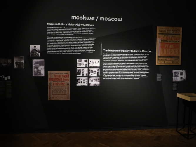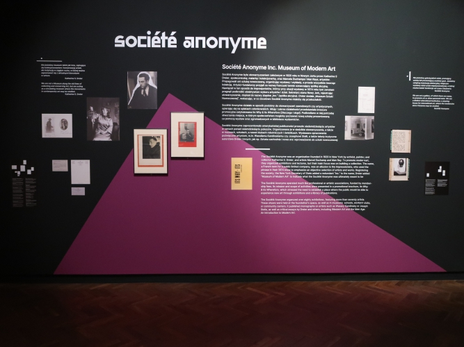 A poznajemy na niej podstawowe informacje, założenia i idee czterech inicjatyw, oglądamy dokumenty, listy, druki, zdjęcia (niektóre powiększone i graficznie przetworzone, co dodaje ekspozycji współczesnego sznytu), do tego dzieła sztuki (autorstwa choćby Kazimierza Malewicza, Pieta Mondriana, Wassilego Kandinsky’ego, Marcela Duchampa, Aleksandra Rodczenki czy Man Raya), ale tym razem są one w pewnym sensie tłem ekspozycji, bo jej clue stanowi przekaz teoretyczny. I wcale nie czujemy się przytłoczeni. Widz ma do dyspozycji dużo przestrzeni, którą w miejscach prezentacji archiwaliów porządkuje graficzna aranżacja wedle projektu duetu Fontarte z zastosowaniem głównie bieli, czerni i czerwieni czy purpury (plus słomkowy kolor delikatnych drewnianych gablotek).