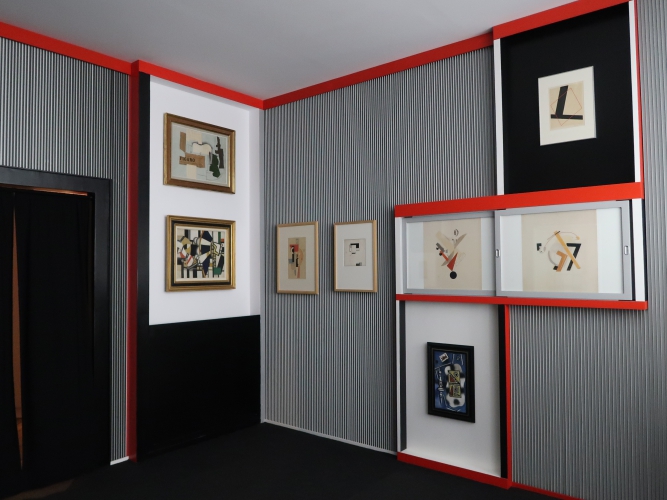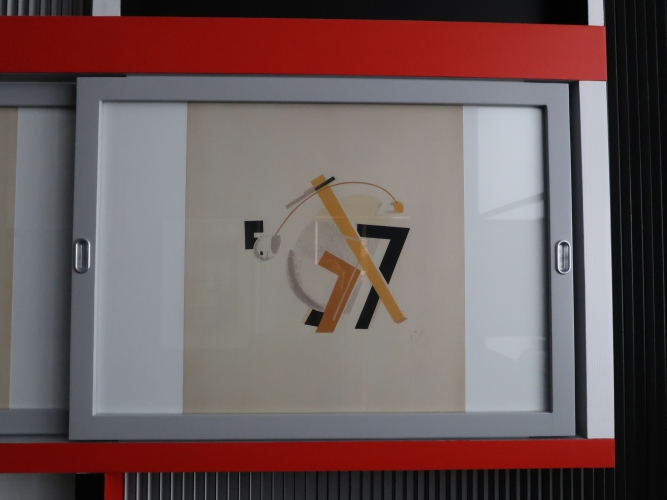 El Lissitzky chciał, by odbiór pokazywanych w Gabinecie obrazów i rzeźb zmieniał się wraz ze zmianą kąta widzenia odbiorcy. Zamiarem było zmuszenie widza do aktywnego, a nie pasywnego odbioru sztuki. Ściany pokrywają dwustronne pionowe listwy, z jednej strony pomalowane na biało, z drugiej na czarno – wraz z przesuwaniem się widza zmienia się zatem tło dla zawieszonych na nich dzieł. Cztery szkice samego artysty do opery „Zwycięstwo nad słońcem” z 1923 roku (wspaniałe, mimo że to reprodukcje) umieszczono na ruchomych panelach, które można przesuwać, zasłaniając jedne prace, a odsłaniając inne. Lustro w narożniku pozwala obejrzeć znajdującą się tu rzeźbę Aleksandra Archipenki także od tyłu. A wszystko to skąpane jest w naturalnym, rozproszonym świetle – artysta zaplanował bowiem mleczne rolety na okno. W kontakcie z tą przestrzenią widz odczuwa ekscytację. Wbrew pozorom dzieła sztuki w niej nie giną, ale każde z nich ma określone miejsce, w którym w pełni wybrzmiewa, współtworząc tę niesamowitą atmosferę.