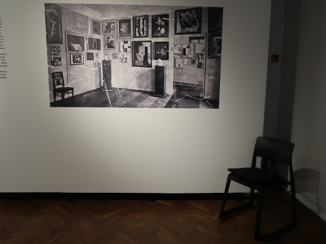 Odniesienie do samej Międzynarodowej Kolekcji Sztuki Nowoczesnej grupy a.r. i początków muzeum także jest na tej wystawie – ale i tutaj pozwolono sobie na przymrużenie oka, wskazując, że na jedynym zachowanym zdjęciu z wystawy owej kolekcji w 1931 r. (autorstwa Włodzimierza Pfeiffera) stoi puste krzesło – jedną z sugestii jest, że było to krzesło, na którym tak niegdyś, jak i dziś zasiadają osoby pilnujące ekspozycji… A to jedna z ważnych funkcji do spełnienia w muzeum.