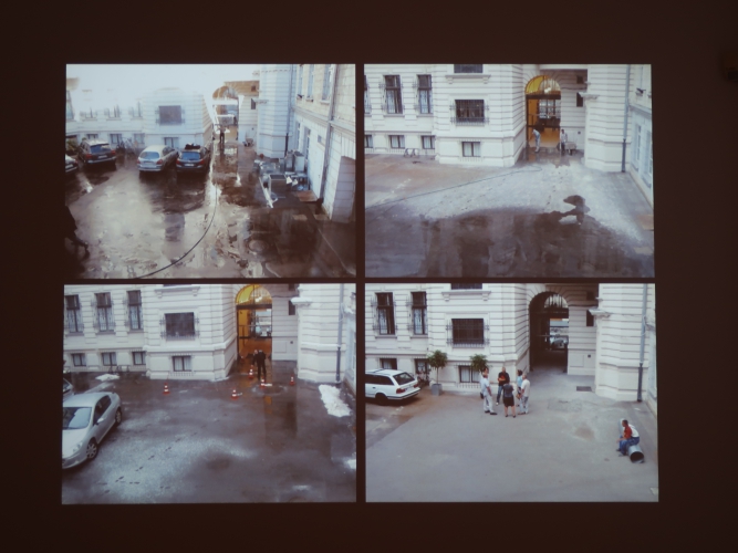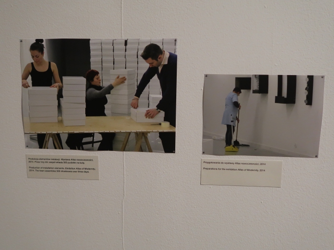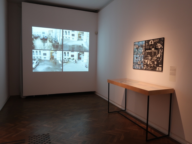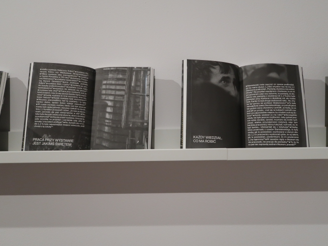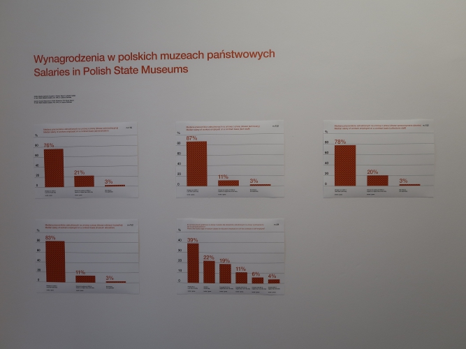 Życie muzeum z perspektywy okna wychodzącego na dziedziniec siedziby przy ul. Gdańskiej od 2003 r. dokumentuje fotograficznie (jak podkreśla – z ukrycia) Maciej Cholewiński z Działu Dokumentacji Naukowej, jeden z kuratorów opisywanej wystawy. Na zdjęciach przewijają się postaci znane i anonimowe, montowane są jakieś konstrukcje, przenoszone dzieła sztuki, jest nawet spotkanie „na szczycie” czterech eleganckich panów przy butelce wody. Realia muzealnej pracy pokazują też archiwalne zdjęcia z przygotowań do wystaw, z przyjęcia daru Josepha Beuysa, z koncertu, pokazu mody czy zajęć edukacyjnych, oraz infografiki prezentujące medianę wynagrodzeń w polskich muzeach państwowych.