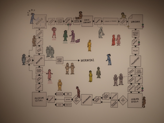 Udało się uniknąć wszystkiego, co mogłoby tę wystawę zepsuć – patosu, przegadania, przeładowania treścią. Nie ma tu dmuchania w balonik. Nikt nie jest pokazany jako ważniejszy od innych, widzimy, że muzeum to zespół – sprawnie działająca maszyna. Tę rzeczywistość dobrze oddaje zamieszczony na początku ekspozycji rysunkowy diagram Mai Demskiej z kolorowymi postaciami, przedstawiający ludzkie zasoby instytucji lekko i z przymrużeniem oka.Dalej wizualnie nawiązuje do niego kolejny pomysłowy diagram w formie gry planszowej, uzmysławiający wielość zagadnień do ogarnięcia podczas pracy z dziełem sztuki. Bo to wszystko nie jest takie proste: wymaga skomplikowanej logistyki, delegowania zadań i odpowiedzialności – a nie zastanawiamy się nad tym, oglądając muzealne wystawy.
