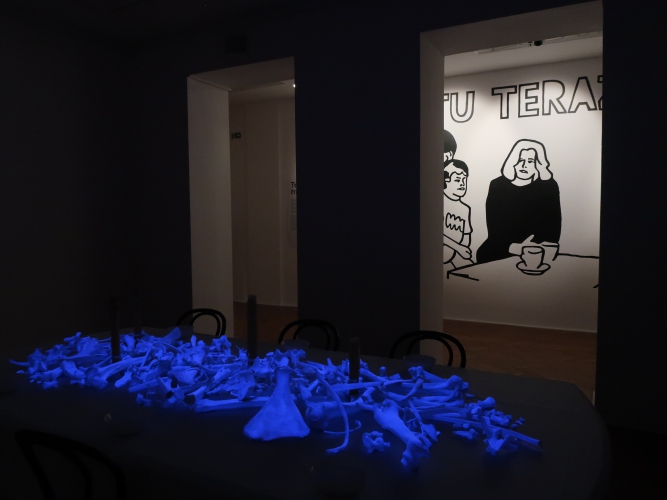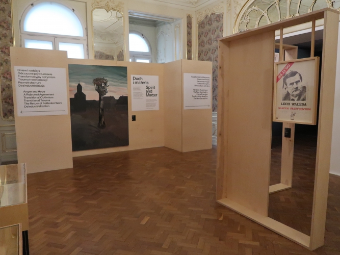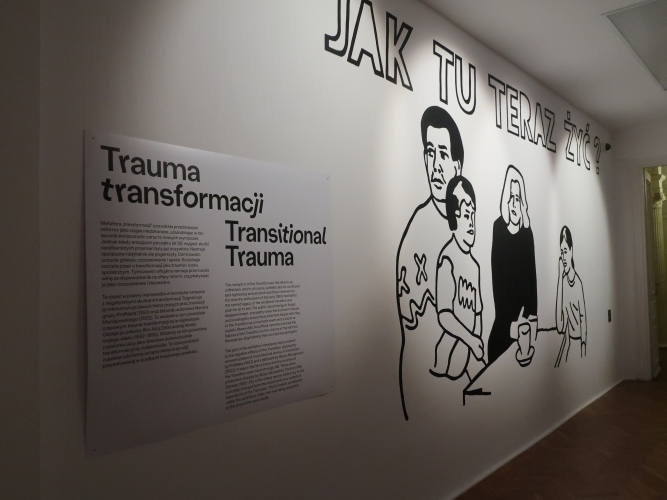 Dwie główne osoby transformacyjnego dramatu politycznego: Wojciech Jaruzelski i Lech Wałęsa są tu traktowane na równi – jako ci, którym nie wolno ufać, którzy decydują „o nas bez nas”. Obrady Okrągłego Stołu to bicie piany (wg Galerii Działań Maniakalnych) – krytyce tych porozumień poświęcono zresztą cały dział wystawy. O dziwo, nigdzie nie pojawia się kluczowa postać Leszka Balcerowicza – architekta ówczesnych przemian gospodarczych w neoliberalnym kształcie, który wtedy wydawał się może akuratny, ale okazał się fatalny w społecznych konsekwencjach, jak szalejące bezrobocie i pozostawienie mas ludzi samym sobie, co do teraz skutkuje patologiami (Łódź dotknęło to w szczególny sposób). Ów profesor ekonomii do dziś upiera się, że wówczas wszystko zrobiono jak należy i nie było alternatywy – krytyka jego sposobu myślenia zaprezentowana na wystawie mogłaby pokaz uaktualnić, podkreślając przykrą prawdę, że nie uczymy się na błędach. Ale nikt się jej nie podjął albo też nikt, kto się jej podjął, nie jest na pokazie reprezentowany. Widzimy tylko bolesne efekty polityki gospodarczej Balcerowicza, wyrażone np. w muralu ze scenką rodzajową i napisem „Jak tu teraz żyć” (Marcin Maciejowski, 2002/2022), czarno-białym obrazie z człowiekiem, który właśnie stracił pracę (Marcin Maciejowski, 2002), w zdjęciu z brodatym mężczyzną jedzącym zupę („Posiłki najuboższych”, Paweł Kwiek, 1990) czy świątecznym stole pokrytym fluoryzującymi białymi kośćmi zamiast potraw (Praffdata „Wieczerza wigilijna”, 1993/2022). Albo poprzez urządzenie z młotem do zabijania ludzi (Artur Żmijewski, 1992). Jako krytykę drapieżnego kapitalizmu lat 90. można odczytać mechaniczną rzeźbę Artura Żmijewskiego „Dmuchawka. Antropomorficzna forma wytwarzająca smród” z 1993 roku, sprowadzającą człowieka do sprawnego przez jakiś czas urządzenia, które potem staje się zbędne.