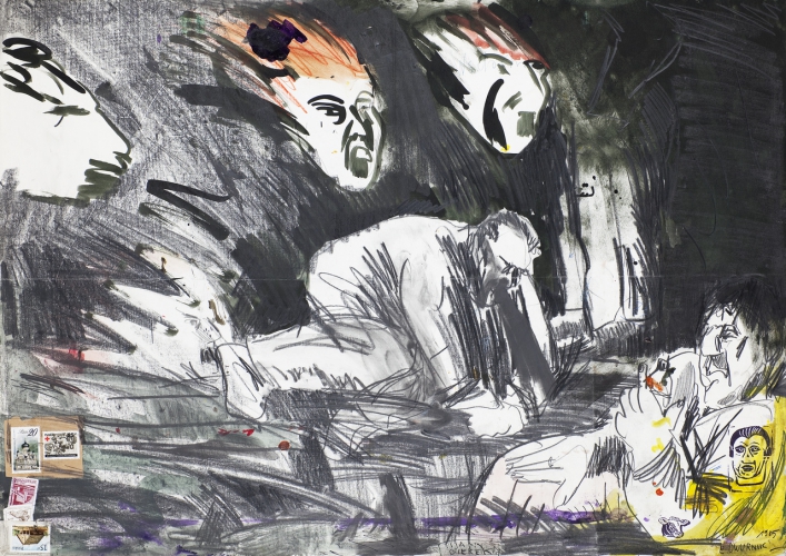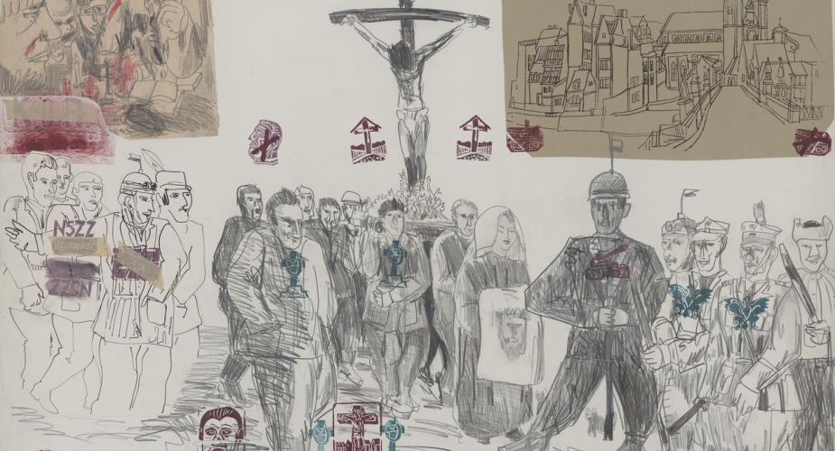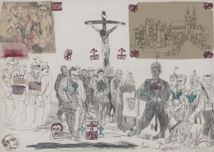 Bywa, że na płótna Dwurnik nakleja znaczki pocztowe. Powierzchnie zapełnia, nie dbając o klasyczne zasady perspektywy, nie zachowując proporcji. Różne rzeczy mogą dziać się tu jednocześnie na kilku planach. Przedstawienia powstają „od niechcenia”, jakby autor nie do końca umiał rysować czy malować. Ale to pozór. Dramatyczne kreski i plamy wyrażają dokładnie to, co artysta chciał przekazać, a gdy trzeba przedstawić konkretną osobę, oglądający nie ma żadnej wątpliwości, że widzi Traugutta czy Gierka – oddać podobieństwo za pomocą paru linii to duża umiejętność. Ten charakterystyczny sposób obrazowania Edward Dwurnik zaczerpnął z malarstwa prymitywnego – ów absolwent warszawskiej ASP (zmarły w 2018 roku) za swojego największego mistrza uważał samouka Nikifora.