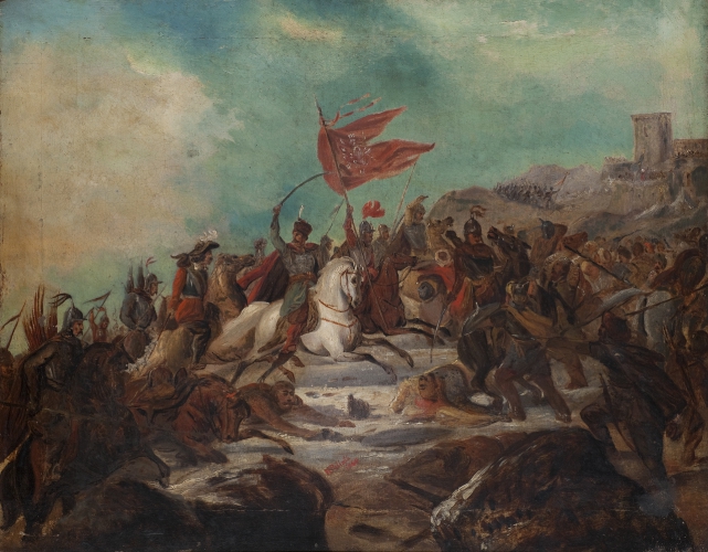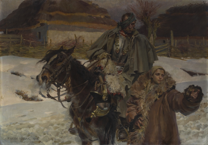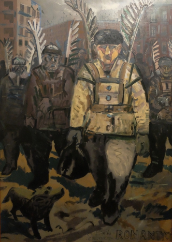 RECENZJA. Ułańska szarża? Tak, ale raczej na monopolowy. Edward Dwurnik obnaża nadymanie mitów dotyczących polskości. Ale nie obśmiewa ich, może nawet je szanuje – na jego obrazach bywa, że husarskie skrzydła wyrastają na plecach robotnikom, gdy nabierają oni krzepy i odwagi, by walczyć o swoje. Pisze Aleksandra Talaga-Nowacka.