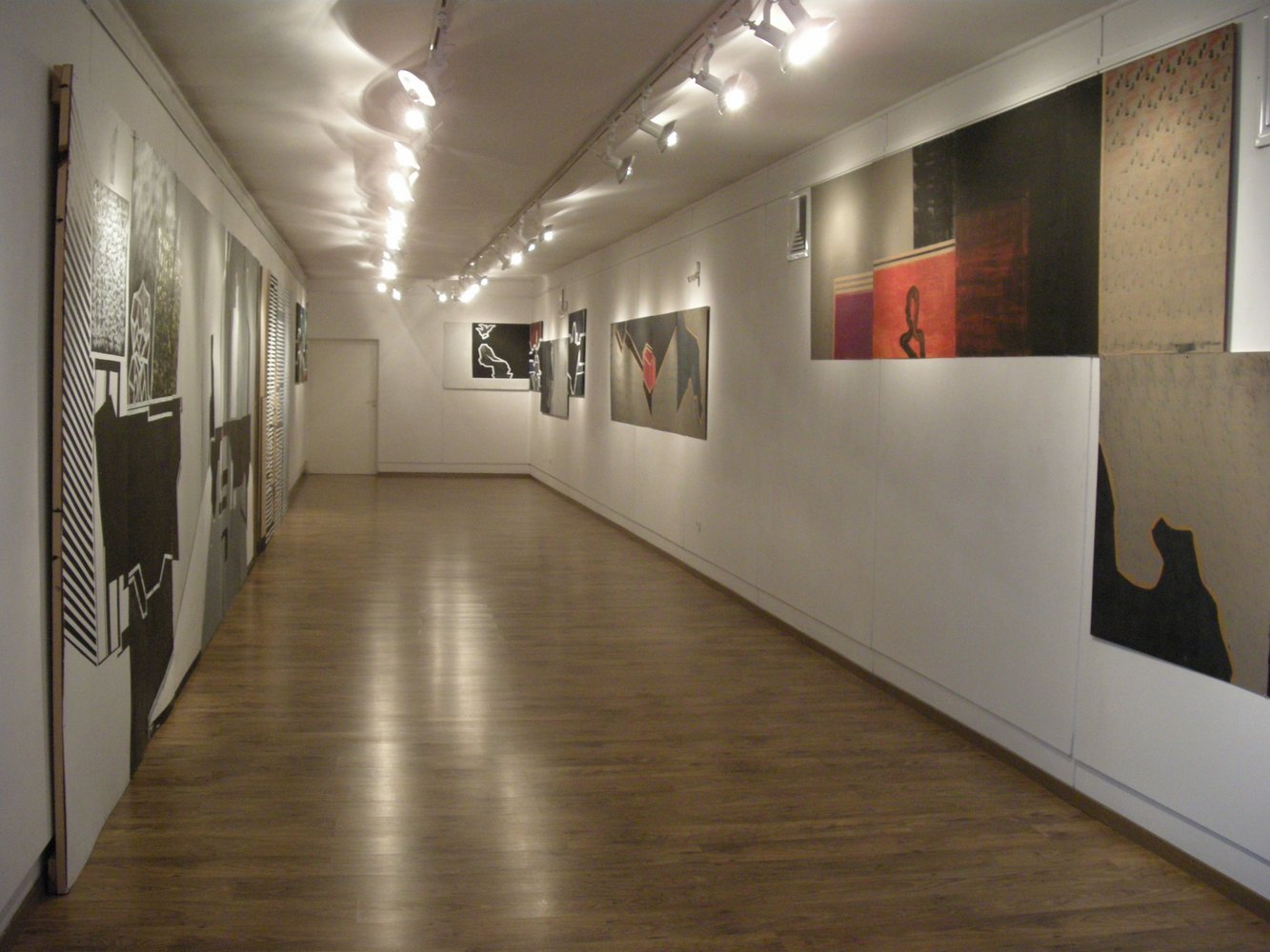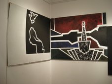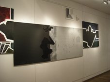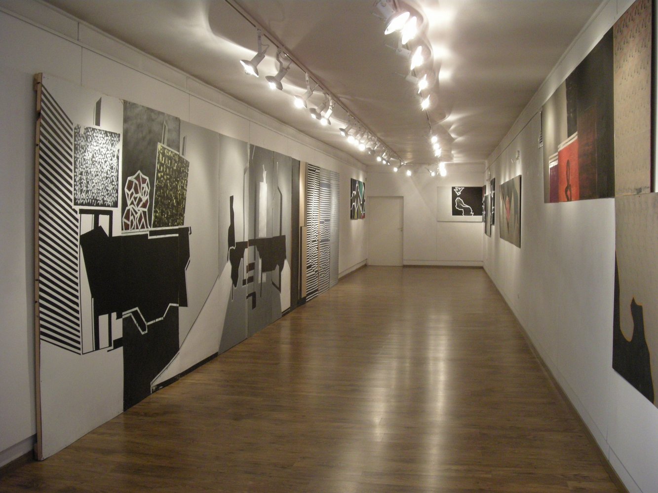 Ciekawy jest cykl „Mia100 Kobro – transmutacja panoramy z/w kobietą/ę”, który może być prezentowany jako ciąg obrazów, albo w rozbiciu na poszczególne moduły – jak w przypadku tej wystawy. Prace odwołują się do łódzkiego krajobrazu. Zarysy budynków są obrębione grubym jasnym konturem wycinającym je z otoczenia, co daje efekt witraża. Niektóre formy mutują w taki sposób, że można w nich dostrzec zarys człowieka. Ta wizja człowieka w mieście jest niepokojąca – leży skurczony na ulicy, na granicy światła i cienia albo spada głową w dół (może to odwołanie do niełatwego życia Katarzyny Kobro). To nie są oczywiste odczytania – wszystko zależy od wyobraźni widza, każdy może tu dostrzec coś innego. W końcu mamy do czynienia z uabstrakcyjnioną rzeczywistością – esencją miejskich realiów, ich istotą, bez zbędnych detali.