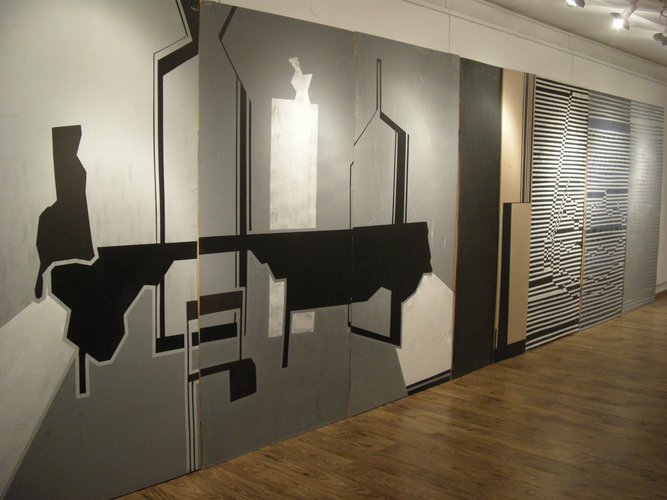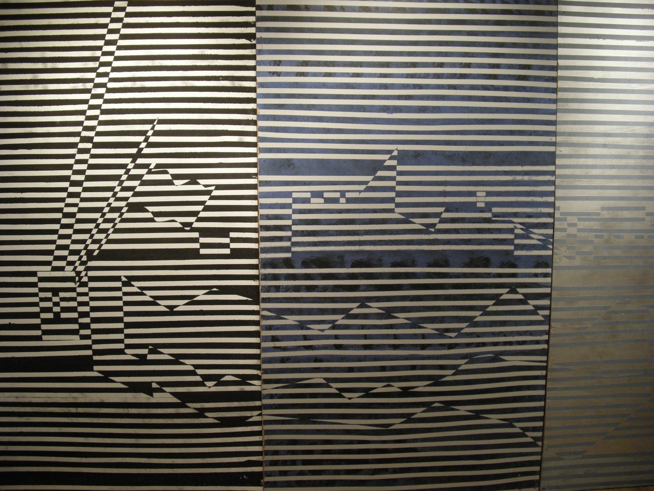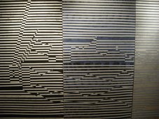 Co do modułów – raczej nie da się ich przestawić, bowiem jedna część fryzu wynika z drugiej, całość ma sens tylko w określonej kolejności modułów. Tak jest również w przypadku „tryptyku” będącego częścią fryzu z wnętrzem mieszkania – trzy z pozoru całkowicie abstrakcyjne obrazy w paski, z których każdy wydaje się odrębny, z bliska okazują się całością z wyłaniającym się niczym znak wodny na papierze zarysem panoramy – może portu?
