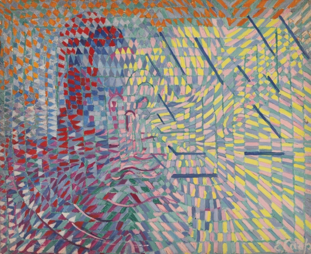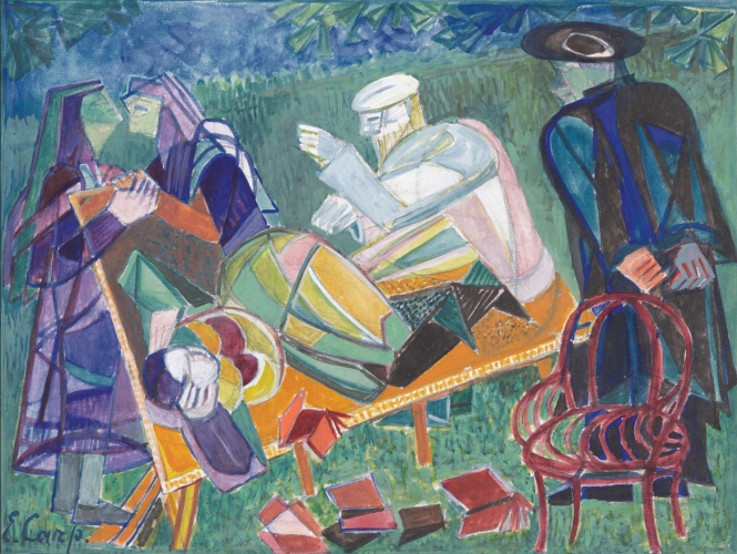 Zagadnienie ruchu artystka eksplorowała również w obrazach o tematyce muzycznej. Przyglądając się prezentowanym na wystawie płótnom: „Grająca na harfie”, „Pianistka” czy przedstawieniom chóralnym, można odnieść wrażenie, że malarka chciała uchwycić wibracje dźwięku, ruch fal akustycznych. Te poszukiwania plastyczne sprawiały, że przestrzeń na jej obrazach ulegała swego rodzaju rozproszeniu i rozczłonkowaniu, charakterystycznemu dla kubizmu. W 1948 roku na paryskim Salonie Niezależnych jej prace eksponowane były w sali przypisywanej „muzykalistom, abstrakcjonistom i nie-figuratywnym rozmaitego autoramentu” – artystom skupionym wokół kubistów Alberta Gleizesa i Jeana Metzingera. Zdaje się jednak, że geometryzacja w twórczości Estery Karp nie wynikała z chęci rozbicia obiektu malarskiego na szereg osobnych płaszczyzn oglądanych w różnym oświetleniu i zestawienia ich obok siebie na nowo, lecz kierowana była synestezyjnymi ambicjami artystki, by poprzez formę i kolor uchwycić pozawizualne wrażenia.
