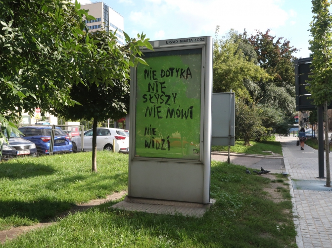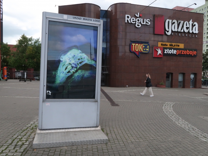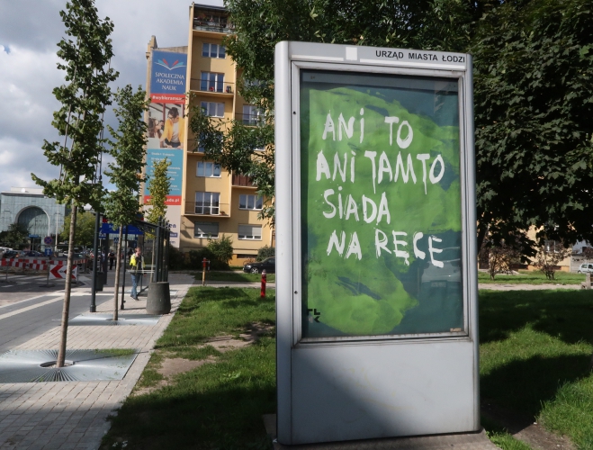 Niektóre prace ograniczają się do minimalnych środków, np. do metaforycznych napisów, inne stawiają na emocjonalny czy symboliczny przekaz – te można próbować rozszyfrowywać. Jeszcze inne nie są łatwe w odbiorze i trzeba uruchomić głębokie rejony wyobraźni, by coś zrozumieć. Ciekawe, że na odczytanie prac mocno wpływa kontekst, w jakim się znalazły – czyli ich otoczenie, bliskość innych wizualnych obiektów, choćby reklam. Gdy na citylighcie przed redakcją „Gazety Wyborczej” widzimy tę samą udręczoną, pokrytą mazią twarz kobiety, co na citylighcie obok stacji paliw Orlen, łączymy w pamięci te wizerunki i pojawia się interpretacja związana z aktualną sytuacją polityczną. Ale praca sprzed redakcji wisi jednocześnie przed wejściem do Galerii Łódzkiej – świątyni handlu, zatem w połączeniu z wizerunkiem sprzed stacji paliw (tutaj jej marka staje się nieistotna) interpretacyjny punkt ciężkości przesuwa się ku szerszej, uniwersalnej perspektywie związanej z komercjalizacją życia, modelowaniem światowych rynków, fatalnym wpływem produkcji, handlu i wydobycia ropy na środowisko… Obrazu dwóch pocieszających się osób w niemal pustej, nieprzyjaznej przestrzeni, zawieszonego ponad reklamą widowiska muzycznego o obronie Westerplatte i bilboardem TNV24 z hasłem „Twoim prawem jest wiedzieć” nie sposób odczytać inaczej niż doraźnie. Ciemna otchłań na citylighcie przy Zamenhoffa, której nie rozświetlają umieszczone w niej zielone refleksy, pochłania całą dookolną przestrzeń i wszystkich jej użytkowników – taki efekt jest spowodowany odbijaniem w tafli szkła citylightu, pod którą jest czarny wydruk (bo z reklamy sztuka przejmuje, poza nośnikami, także formę – to właśnie wielkie wydruki na papierze).