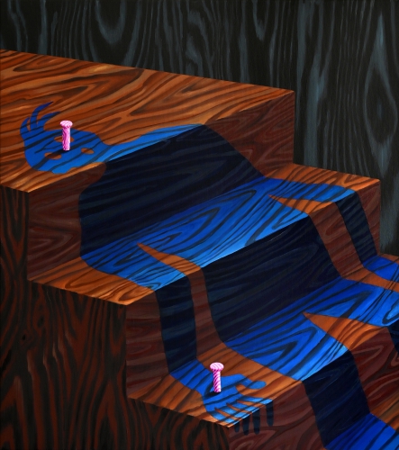 Prezentowane na wystawie w galerii Art Hub Rydzowa prace wskazują na zainteresowanie artysty współistnieniem materii stałej i nieożywionej oraz tej żywej, o charakterze bardziej efemerycznym. Malarz bawi się tymi kontrastami np. przedstawiając powierzchnię drewnianych schodów, która, z pozoru „martwa”, zdaje się trwać w ciągłym ruchu za sprawą obecnych na deskach słojów przybierających różnorakie kształty. Dalej na tle schodów artysta umieścił cień, z natury ulotny i nieuchwytny, lecz na płótnie Olszyny przytwierdzony do drewna gwoździami i zniewolony.