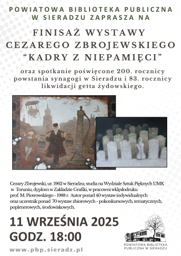 Powiatowa Biblioteka Publiczna w Sieradzu im. Władysława Broniewskiego zaprasza 11 IX o godzinie 18.00 na finisaż wystawy Cezarego Zbrojewskiego „Kadry z niepamięci”, upamiętniającej powstanie synagogi w mieście oraz 83. rocznicę likwidacji sieradzkiego getta.