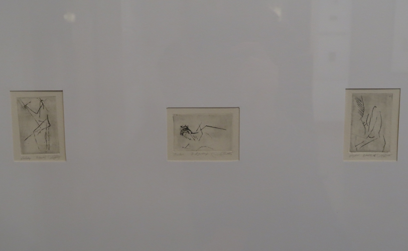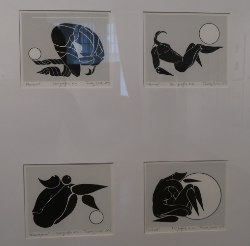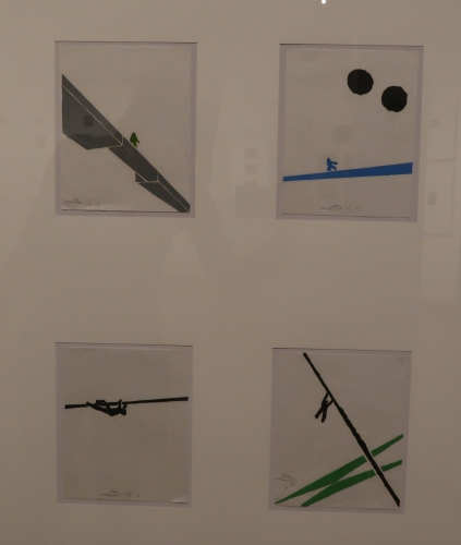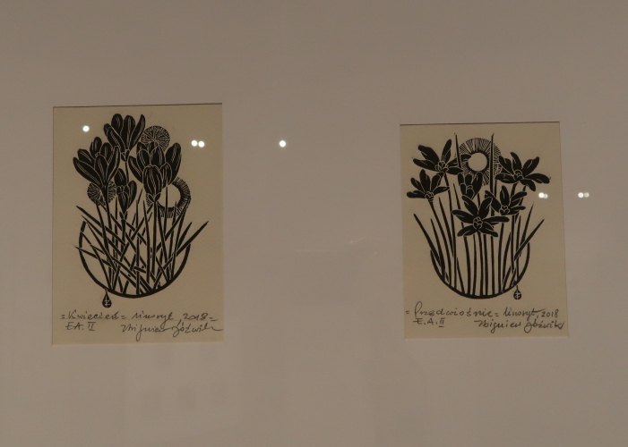 Małgorzata Jabłońska w swoich pracach kontrastuje białe formy z czarnym tłem. „Ludziki” zbudowane z prostokątów trzymają w „rękach” linie układające się w różne znaki. Raz jest to symbol nieskończoności, innym razem znak zapytania albo omega. Czarne kwiaty Zbigniewa Jóźwika rozczulają secesyjną urodą. Grafiki Taichi Kodane z Japonii składają się z delikatnych pastelowych plam kładzionych błyszczącym jak lakier tuszem. Maciej Lercher wykorzystuje formy tak subtelne, że trzeba podejść bardzo blisko, by dostrzec, co właściwie jego grafiki przedstawiają – delikatne czarne, „szarpane” linie układają się w zarysy postaci ludzkich.