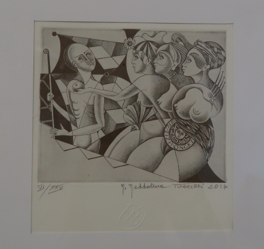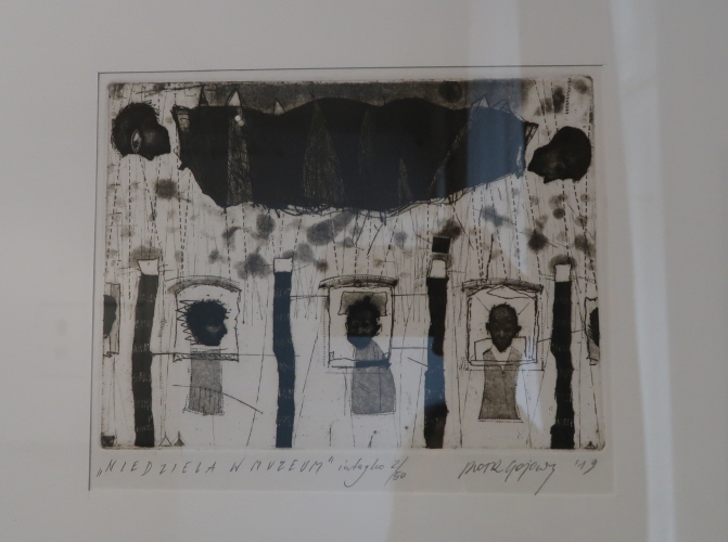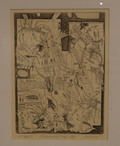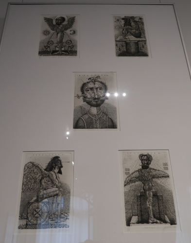 Maria Maddalena Tuccelli z Włoch w modernistycznym, ozdobnym stylu pokazuje rodzajowe scenki. Oleg Denisenko z Ukrainy daje próbkę jakby renesansowego ducha; obdarza dojrzałego mężczyznę z zarostem, kojarzącego się z don Kichotem, a to skrzydłami, a to rycerską zbroją. Co za precyzja wykonania! Podobnie jak w przypadku Lva Borisovicha Alimova z Białorusi, który na zasadzie horror vacui zapełnia najczęściej różnymi stworzeniami niemal całe powierzchnie grafik. Jedna z prac to skomplikowany kalambur pełen częściowo odwróconych napisów cyrylicą. Są w niej odniesienia np. do Baracka Obamy czy ZSRR. Wspaniała, kunsztowna grafika. Byłam przekonana, że autorem jest młody wywrotowy artysta – dopóki nie znalazłam w katalogu wystawy jego daty urodzenia: 1945!