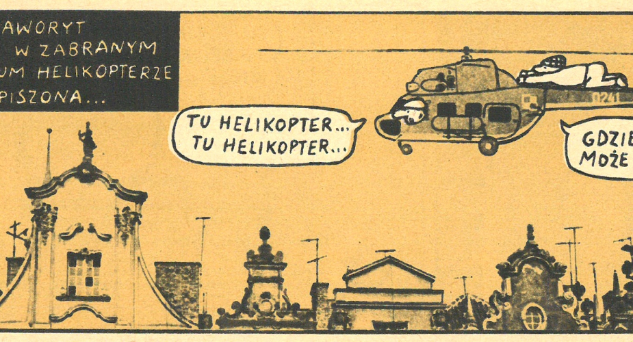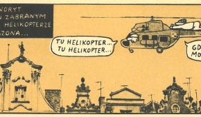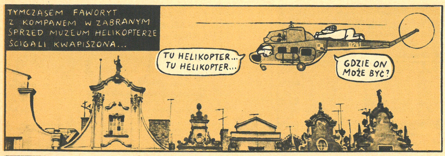 Wystawę przygotowaną na 30. „emefkę” będzie można oglądać jesienią w EC1. Myślę, że zajrzy na nią największy wydawca komiksów w Polsce. Kolega – dziennikarz ze studiów być może też. I Państwa nie może na niej zabraknąć – musicie zobaczyć pozostałe kadry, które wybrałem. Na przykład ten z klasycznego komiksu narysowanego przez nestora polskiej ilustracji i obrazkowej narracji, w którym złoczyńcy ścigają głównego bohatera, lecąc kradzionym helikopterem…