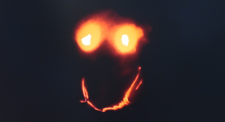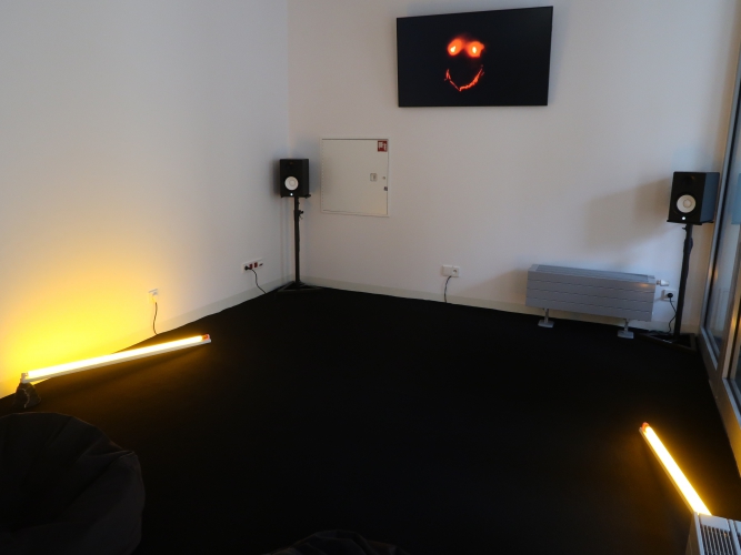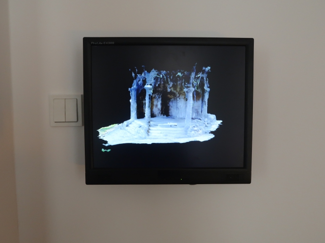 Od strony widza w kierunku ekranu, zgodnie z perspektywą zbieżną, ciągną się dwie linie tworzone przez świecące żółto świetlówki. Mogą symbolizować spływającą lawę; każą się nam skupić, jak światła naprowadzające samoloty na lotnisku. Jest jeszcze jeden element instalacji – wyświetlany na małym ekraniku obracający się nieustannie model 3D groty z parku Helenów. Jak model świata, który tracimy…