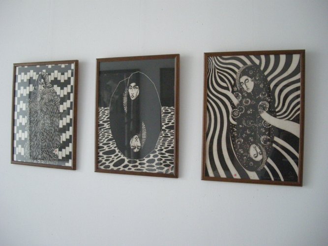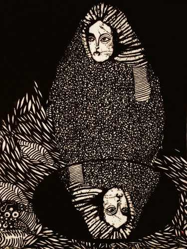 Kobieta z graficznych obrazów (wykonanych techniką znaną tylko autorce), tak jak jej mitologiczny pierwowzór – Isztar, bogini zarazem wojny i miłości – zbudowana jest ze sprzeczności. Niby krucha, a silna. Niby łagodna, a surowa. Niedostępna, a jednak swoim pięknem wabiąca do podejścia bliżej. Zawsze szczelnie osłania ją ubiór-kokon, z którego wyłania się jedynie wspaniała twarz Madonny. Kokon czasem zlewa się z otoczeniem tak, że Isztar staje się częścią tego, co wokół, elementem złożonej całości. Bywa, że jest to rodzaj dżungli z formami roślinnymi i zwierzęcymi. I znowu nie wiadomo: ten świat ją wchłania, czy może ona wynurza się z niego, ukształtowana z jego minerałów i soków, gotowa do samodzielnego życia. Podwójność, sprzeczność to istota sztuki Natalii Kalisz. Kobieta, jak w kartach do gry, powiela się, staje się swoim zafałszowanym odbiciem – zafałszowanym, bo „odbita” twarz skierowana jest w przeciwną stronę niż ta właściwa. Co jest prawdą, a co jej obrazem?