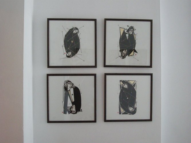 W trzech większych pracach, które znalazły się na wystawie, mamy do czynienia z odmienną, zupełnie inaczej budowaną postacią – mniej w niej metafizyki i metafory. To rzecz bliższa ziemi niż zaświatom. Niepokojąca. Kształt rozchylonych ust ujawnia, że nie mamy do czynienia z człowiekiem, lecz z drewnianą lalką, kukłą z teatrzyku – choć oczy sugerują coś innego. Na jednej z prac ta postać (już nie przypominająca kukły) znów się rozdwaja – ma już nie tylko dwa oblicza, ale nawet dwa serca, a właściwie jedno przepołowione.