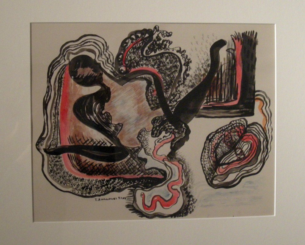 Oczywiście tę „nieudolność” można potraktować jako zaletę, a jednak gwasze i rysunki mogą się nie podobać – mnie nie zachwycają (wyjąwszy te ze śladami profesjonalizmu). I miałabym mieszane uczucia, gdyby to była wyłącznie ich wystawa. Taki był zresztą pierwotny zamiar – Milada Ślizińska, znana warszawska kuratorka wystaw międzynarodowej sztuki współczesnej (przez lata była związana z Centrum Sztuki Współczesnej Zamek Ujazdowski), zaproponowała Muzeum Sztuki w Łodzi zrekonstruowanie ekspozycji 16 gwaszy Teresy Żarnower w nowojorskiej galerii Art of This Century Peggy Guggenheim z 1946 roku. Ale w czasie przygotowań dowiadywała się o artystce coraz więcej i projekt wystawy pęczniał (rekonstrukcja jest tylko jego częścią, a do projektu trzeba było zaprosić największego polskiego znawcę sztuki awangardowej, Andrzeja Turowskiego, który już w latach 60. zainteresował się Żarnowerówną i szukał o niej wiadomości, wymieniając listy m.in. z jej bratem). Dzięki temu mamy ekspozycję o tułaczce zasymilowanej polskiej Żydówki – awangardowej artystki – w czasach II wojny światowej. To los wielu ludzi. Wyjazd z Polski do Paryża w 1937 roku. Stamtąd ucieczka do Lizbony przez Madryt. Gdy portugalskie władze stawały się coraz mniej przychylne żydowskim uchodźcom, próba przedostania się do Ameryki. Także i tutaj nie witano ich z otwartymi rękami: aby móc wejść na amerykański ląd, trzeba było wykazać, że jakiś amerykański obywatel (najpierw jeden, potem – dla utrudnienia – dwóch) będzie utrzymywał przybysza i że nikt z rodziny nie został na terenach okupowanych – takich ludzi uważano w Stanach za Niemców i obawiano się że ich bliscy w USA staną się „piątą kolumną”. Tymczasem siostry Żarnower były zamknięte w warszawskim getcie… Dlatego, choć artystka dobiła na statku do nowojorskiej wyspy Elllis, do Stanów jej nie wpuszczono. Tak znalazła się w Kanadzie. Później dostała jednak prawo pobytu w USA.