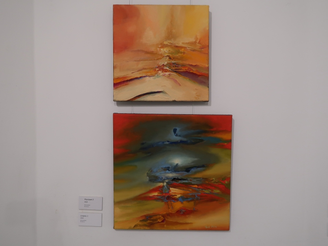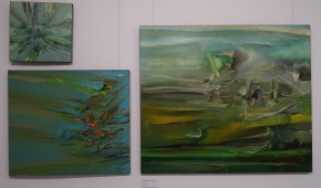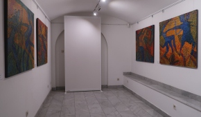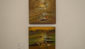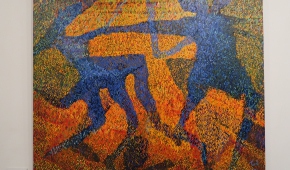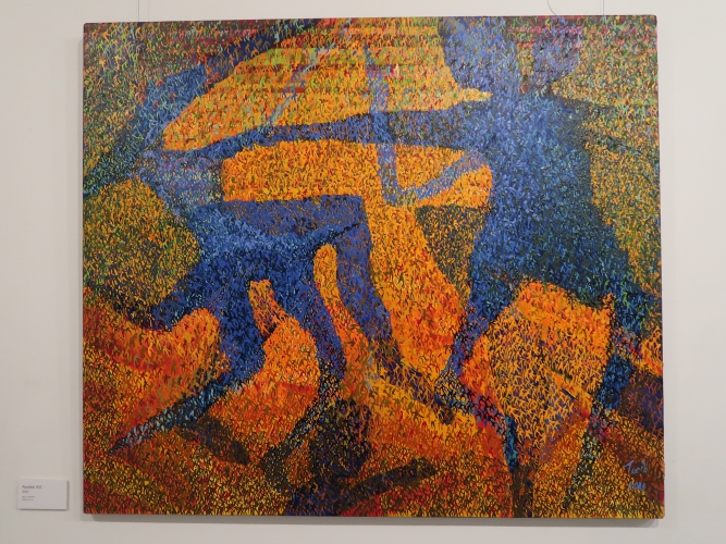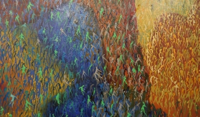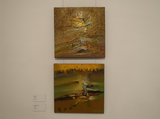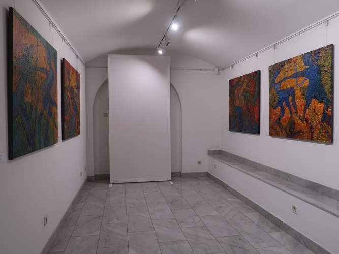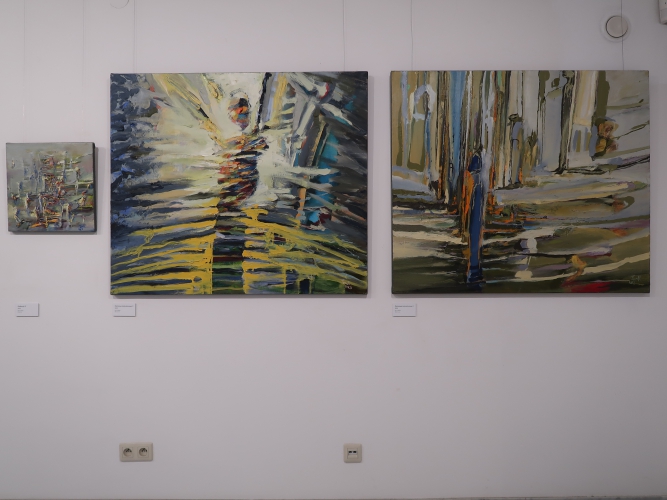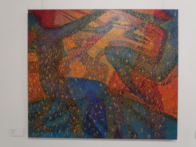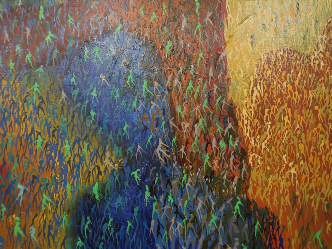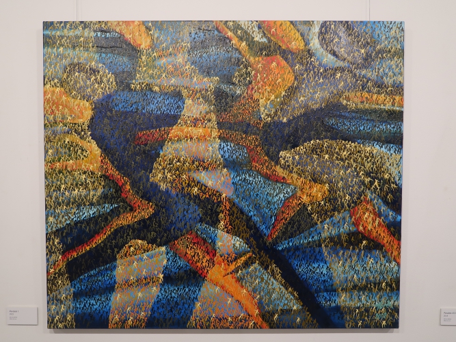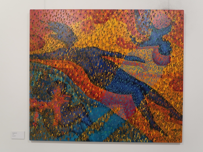W zajmującym osobną salkę galerii cyklu „Paralele” (tworzonym od wielu lat, a tutaj reprezentowanym przez prace z lat 2018–22) całą przestrzeń obrazu niemal równomiernie wypełniają miniaturowe, uproszczone sylwetki ludzi – ich grupy malowane są różnymi odcieniami, tworząc wspólnie „plamy” barw, które budują kolejne formy i w ten sposób zarysowują się także większe sylwety-cienie, które kojarzą się z prehistorycznym malarstwem naskalnym. Te obrazy sprawiają wrażenie, jakby składały się z kilku warstw – jak geologiczne osady, w których odnajdujemy ślady tego, co było. To łączniki pomiędzy czasami. Rozmowa przeszłości z teraźniejszością – koloraturowa, bo wymagająca kunsztu.