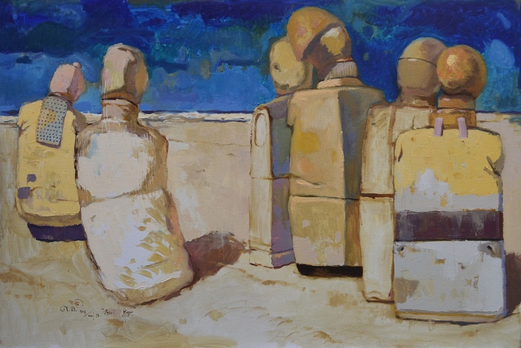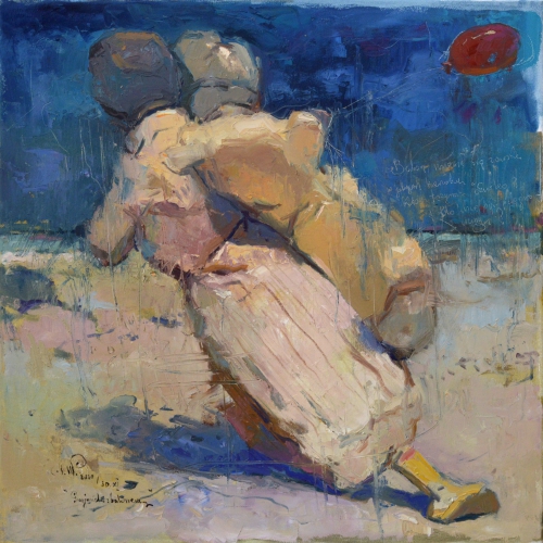 Z jednej strony bazuje pan na prostych skojarzeniach: zieleń oznacza nadzieję, ciepłe odcienie to bliskość. Z drugiej – od początkowego realizmu coraz bardziej odchodzi pan ku uabstrakcyjnianiu, postacie ludzkie stają się bryłami przypominającymi a to worki, a to meble, drewniane ciosy, tekturowe pudełka. Dokąd prowadzi pana ta droga?