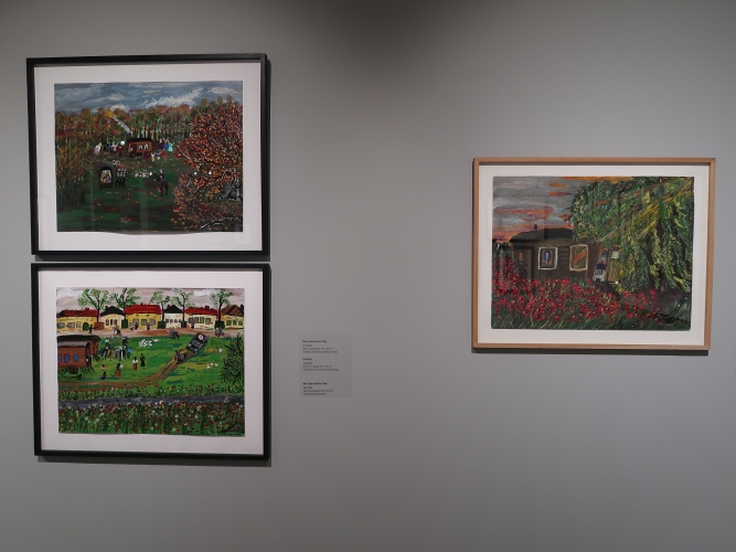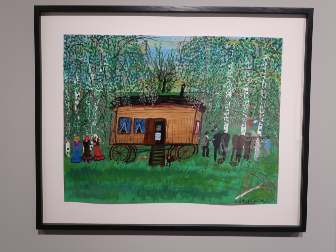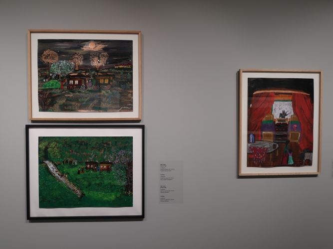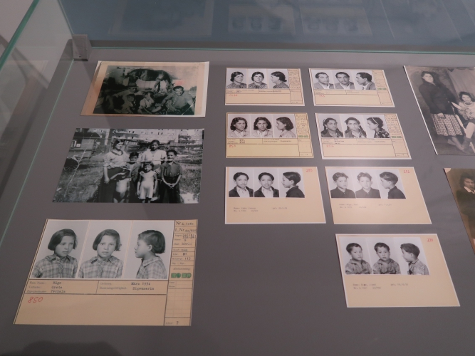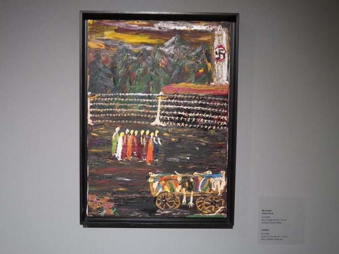 Na pierwszą część ekspozycji składają się obrazy sielskie – to życie artystki, zanim zaczął się koszmar. Barwne i sprawiające wrażenie beztroskiego cygańskie życie. Z wozami, końmi, kolorowymi ubraniami, muzyką, blisko natury. Te miłe chwile szybko się skończą. To w ogóle ostatnie tchnienie owej cygańskiej swobody. Jako wizualizację momentu przejściowego można odczytać obraz wiszący zaraz przy wejściu na wystawę („Bez tytułu. Uwaga, uwaga. Rossauer Lӓnde. Auschwitz. Krew płynie. 1943” z 2005 r.): wielokolorowy tłum zgromadzono w szarej celi, a za nią, odcięty wyraźną linią, jest już prawie czarno-biały, brutalny świat obozu, ożywiony jedynie przerywaną, czerwoną linią krwi i żółtymi kwiatkami. Na obrazie umieszczonym pod spodem, namalowanym tego samego wrześniowego dnia, a przedstawiającym Ravensbrück w 1944 r. i jego wyzwolenie w 1945 r. kolor (zielony) mają tylko drzewa – zwartym prostokątem otaczają masowy grób, nad którym stoją ludzie, którzy nie są nawet cieniami, są zaledwie pociągnięciami pędzelka. Na obu tych obrazach, tak jak i na wielu innych, rzeczywistość oglądana jest z góry – z dystansu. Takiego, jaki mamy do tych wydarzeń my, współcześni widzowie.