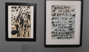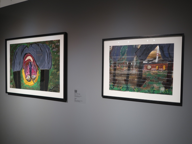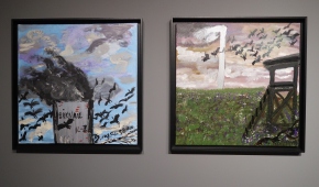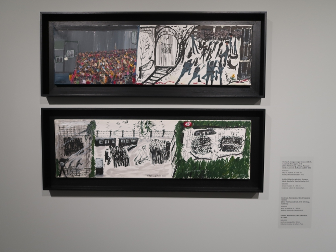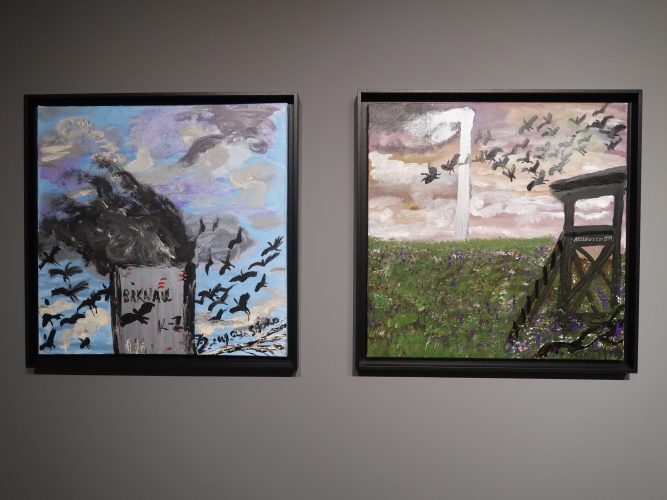 Dwa obrazy malowane są z perspektywy dziecka – tak jak realizuje się niektóre animacje dla dzieci. Na jednym oglądamy nogi esesmanów do wysokości ud, a za nimi obóz. Na drugim – „żartobliwym” – spomiędzy umundurowanych, widzianych od tyłu nóg wyłania się odwrócona, roześmiana blond głowa, jakby ktoś robił „a kuku, mam cię”. O nieustającym poczuciu obserwowania Cejia Stojka mówi we wspomnianym filmie – zdawało jej się, że nawet drzewa ją obserwowały, nawet one były wrogie… Czy wielkie zielone oko, które zajmuje powierzchnię całego jednego obrazu, jest takim obserwatorem, czy może symbolem strachu? Odbijają się w nim krematoryjny komin i wrona zostawiająca krwawe ślady, a na białku rysują się blizny w formie drutów kolczastych.