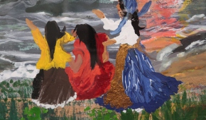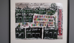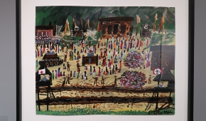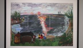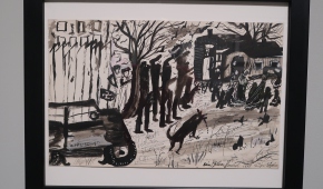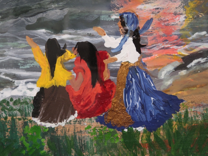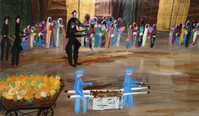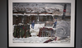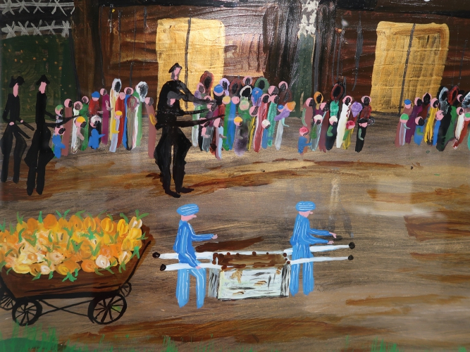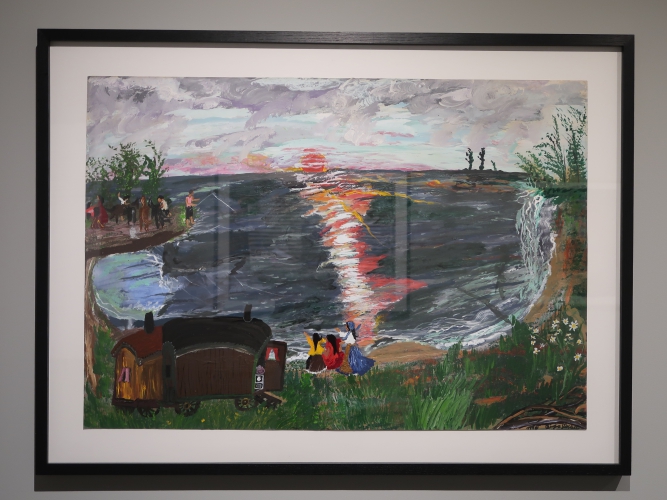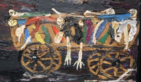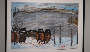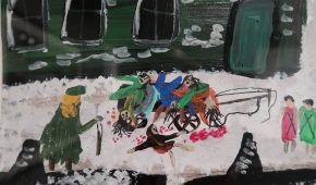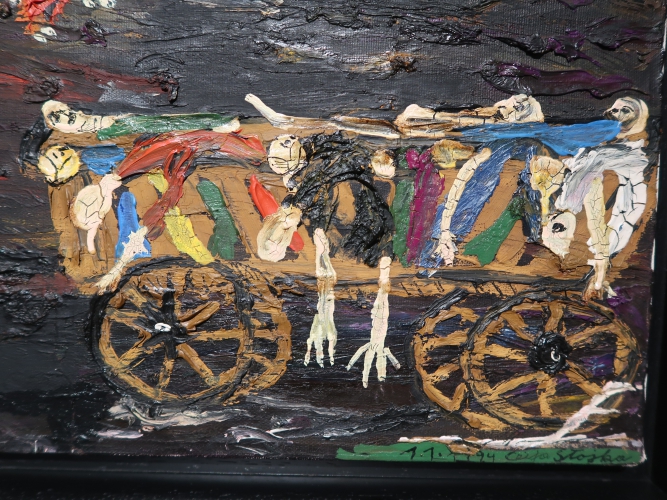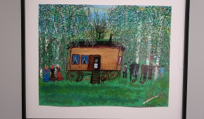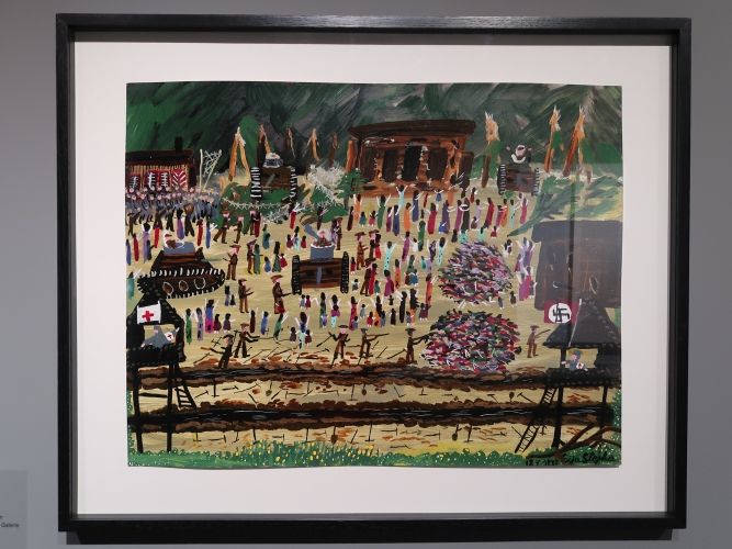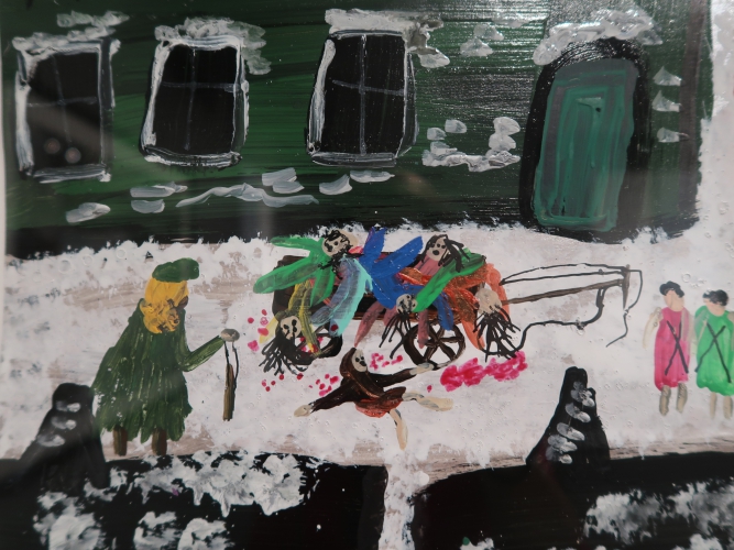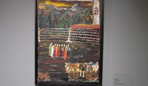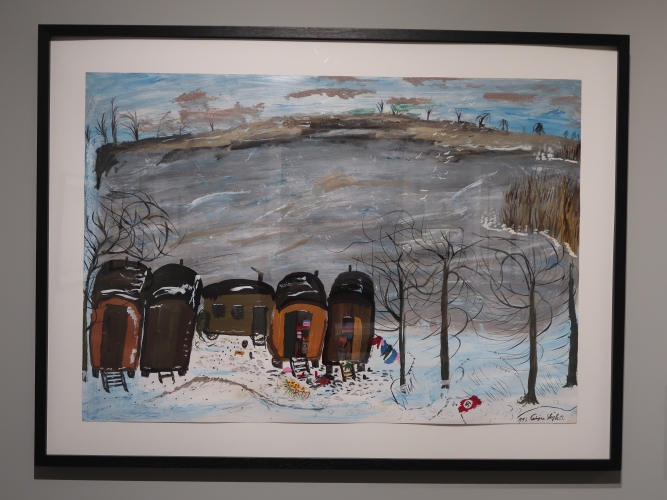Porażający jest obraz, na którym spoza kolorowych traw widać tylko kilka par oczu. Na innym w spokojną rzeczywistość małego, kolorowego miasteczka wkracza wojna w postaci hitlerowskich motorów i samochodu. Gdzie indziej pośród ekspresyjnego zimowego krajobrazu pozostały puste cygańskie wozy, a przed nimi bałagan – sprawcy pozostawili w białym śniegu krwiście czerwoną hitlerowską flagę.