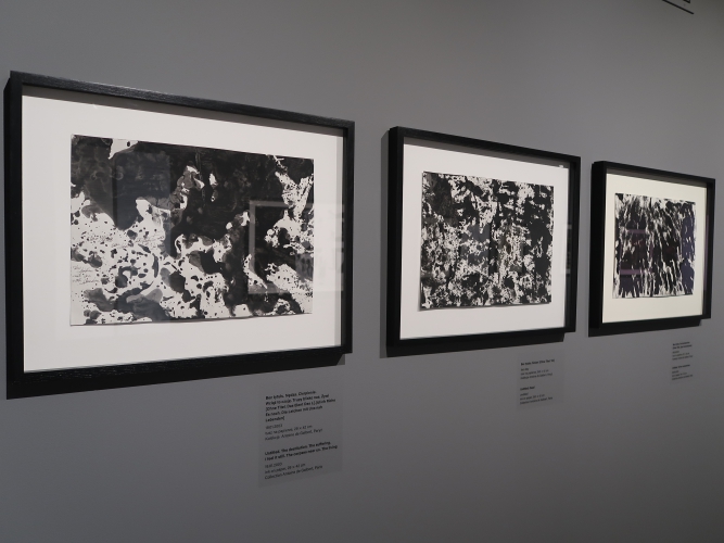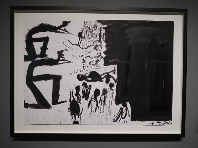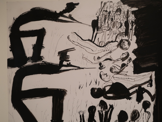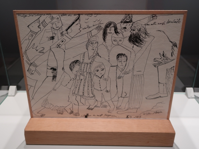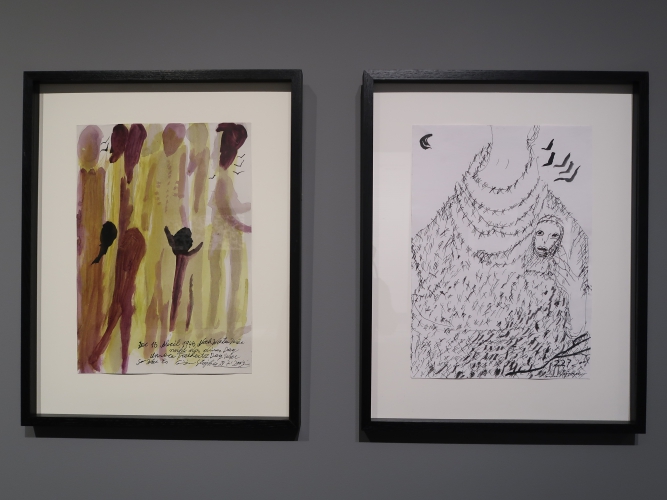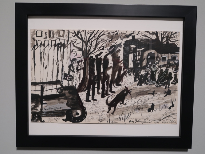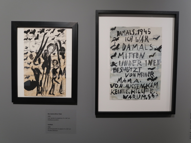 Niesamowite są czarno-białe rysunki tuszem, dokumentujące dramatyczne wydarzenia –niezręcznie jest oceniać estetykę takich przedstawień, ale mimo to napiszę, że wszystkie są bardzo ciekawie zakomponowane. A rysunek „Bez tytułu. Pociągi są już pełne, ale musimy wsiąść…” z 2005 r., z przytuloną do siebie rodziną w centrum i nazistami po bokach (na awersie) oraz delikatną łączką (na rewersie) uważam za jedną z najlepszych prac na wystawie. Podobnie jak inny – „Bez tytułu. Raport…” z 1998 roku. Albo „Bez tytułu” z 1995 r. – to scena rozstrzelania, która siłą wyrazu i genialną kompozycją może konkurować z obrazami Andrzeja Wróblewskiego. Albo kolejny nietytułowany rysunek z 1998 r. – z rodziną stojącą przy drutach kolczastych, za którymi ulatują wrony. Te ptaki pojawiają się w wielu pracach Stojki. Z wypowiedzi artystki wiemy, że uważała je za dusze zmarłych bliskich.