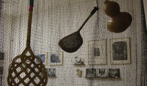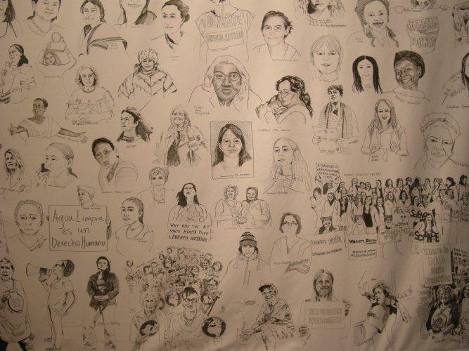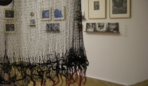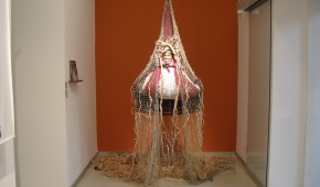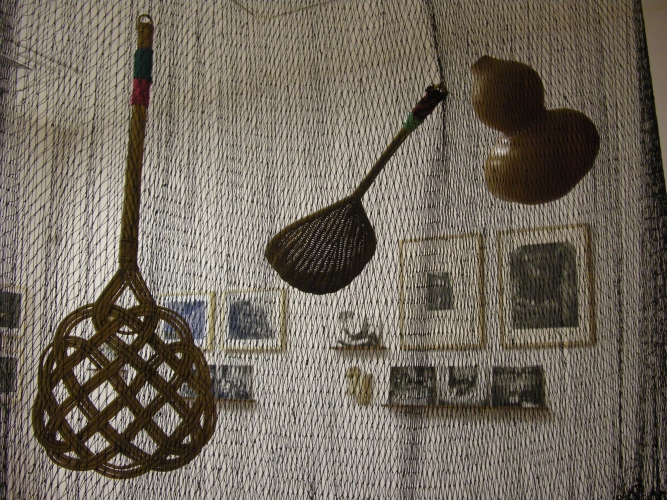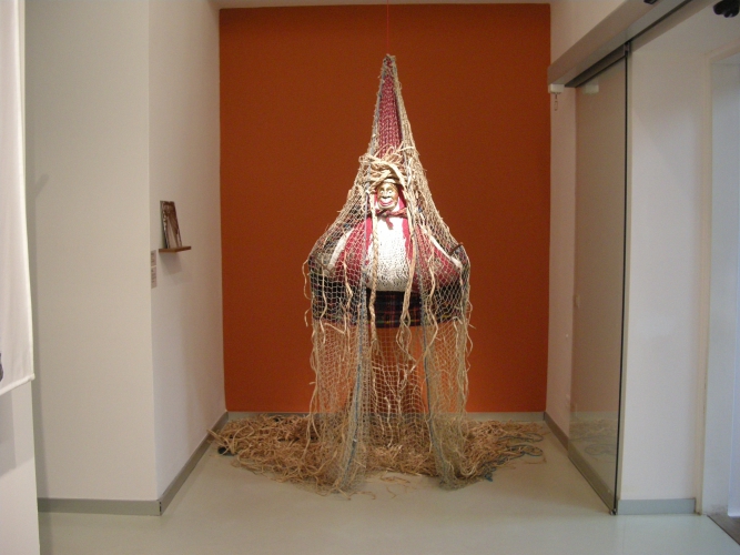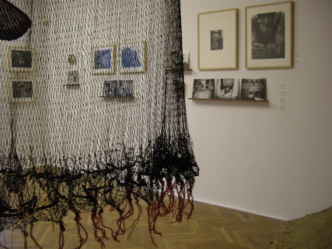 Inny obiekt z sieci, wioseł, odważników, sita, ale i wkładki domacicznej, równie subtelnie (choć tutaj dominuje nad innymi pracami) wpisuje się w przestrzeń drugiej sali wystawowej, zwisając z sufitu pośród zdjęć Zofii Rydet. Sam początek wystawy, jej „przedsionek”, poświęcony jest stricte twórczości Caroliny Caycedo. A i tak zaczynamy od obejrzenia zestawu portretów aktywistek (czasem z hasłami na transparentach) naniesionych na tkaninę. Dopiero drugie spojrzenie pada na „szamański” obiekt, który tworzy klamrę całej prezentacji. To przedstawienie kolorowej, zmysłowej „Wielkiej kobiety” – Matki Ziemi, bogini życia.