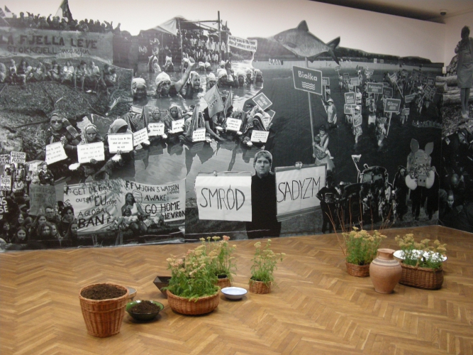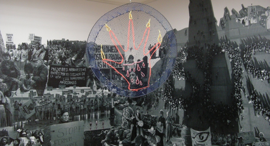 Zaproszona przez Muzeum Sztuki w ramach cyklu „Prototypy” do przepuszczenia jego kolekcji przez własną artystyczną wrażliwość, Caycedo odnalazła w zbiorach to, co jest jej bliskie – fotografie Zofii Rydet z cyklu „Zapis socjologiczny” z lat 1978-90, który utrwalił odchodzący świat z tradycyjnym podziałem ról społecznych na kobiece i męskie. Na reportażowych zdjęciach Rydet stare kobiety w starych chałupach wykonują domowe czynności: obierają ziemniaki, robią przetwory, podają obiad (choć są i ujęcia z zakładów pracy, sklepowej za ladą czy portret dziewczynki siedzącej na czyichś ramionach podczas manifestacji i pokazującej dłonią znak victorii – w innym kontekście można by te zdjęcia uznać za wizualizacje nowego świata, w którym kobiety wychodzą z domów i podejmują dotychczasowe męskie role – ale nie na tej wystawie; tutaj rozumiane są jako wciąż ta sama troska o otoczenie) lub po prostu są. Carolina Caycedo uważa, że tradycyjne czynności zapisane są w pamięci – genów czy mięśni. Dłonie kobiet je pamiętają i gdy cywilizacja runie i trzeba będzie budować świat od nowa, to na tej pamięci będziemy musieli się oprzeć. Stąd odlewy dłoni w różnych gestach towarzyszące prezentowanym na wystawie zdjęciom Rydet.Caycedo przenosi rozumienie roli kobiety jako opiekunki ogniska domowego na aktywności w obronie Ziemi. Punktem wyjścia jest konstatacja artystki – nie wiadomo, czy prawdziwa – że to głównie kobiety angażują się w obronę przyrody, w walkę przeciw psuciu klimatu. Większą część wystawy stanowi wielki, zajmujący trzy ściany fotokolaż ze zdjęć przedstawiających kobiety w akcjach proekologicznych. Skoro wystawa odbywa się w Polsce, to są to w większości polskie aktywistki i polskie akcje, choćby w obronie Puszczy Białowieskiej, przeciwko nadmiernej wycince drzew (słynna akcja, w której matki karmiły dzieci piersią na pniakach po ściętych drzewach) czy Młodzieżowy Strajk Klimatyczny. Ale krajobraz dopełniają zwykłe kobiety walczące wyłącznie o los swój i swoich bliskich – staruszka z grabiami, kolejna z naręczem gałęzi, jeszcze inna prowadząca krowy na wypas. Duży fragment czwartej ściany zajmuje lista organizacji, których akcje zostały przedstawione. W tym otoczeniu prawie niknie subtelna praca samej Caycedo z sieci rybackich, z dłonią wpisaną w okrąg (koło życia?). Z palców strzelają płomyki, po dłoni spływają krople. Czy to symbol zaangażowania mimo trudności, mimo potu, łez i krwi?