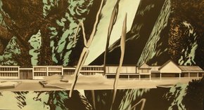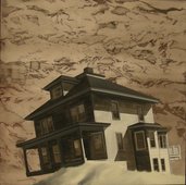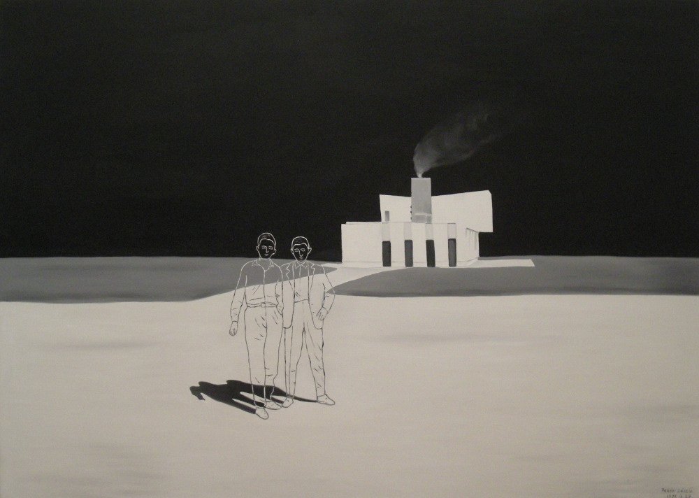 Pozostałe obrazy przedstawiają domy (czasem przekrzywione) na tle krajobrazu mniej lub bardziej uabstrakcyjnionego. Tyle że te domy są opuszczone, a może nigdy nie zamieszkane – nie ma w nich śladu obecności człowieka. To bryły na tle płaszczyzny.