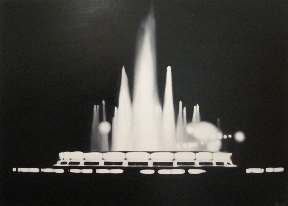 Abstrakcyjne, gładkie tło, albo uabstrakcyjniony pejzaż to również domena płócien László Fehéra. Tutaj też widzimy ludzki twór – tym razem miasto, także wyludnione. Artystę interesuje zwłaszcza jego nocny wygląd – wtedy lepiej widać kontrasty: podświetlona fontanna albo białe światło latarń na czarnym tle. Kontrasty dobrze wydobywa się w tonacji czarno-białej – Fehér często rezygnuje z pozostałych kolorów. Na przykład w autoportrecie, namalowanym w taki sposób, że tułów podzielony jest na dwie części: dolna znalazła się na górze, a dłonie trzymają bohatera za głowę…