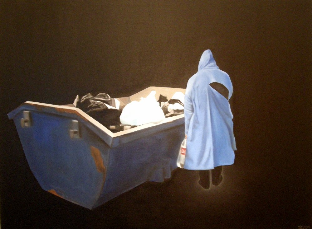W kontraście lepiej wydobywa się istotę sprawy. Obraz z bezdomnym przy kontenerze ze śmieciami jest bardziej wymowny przez to, że niebieski kontener i niebieski płaszcz człowieka kontrastują z gładkim czarnym tłem.